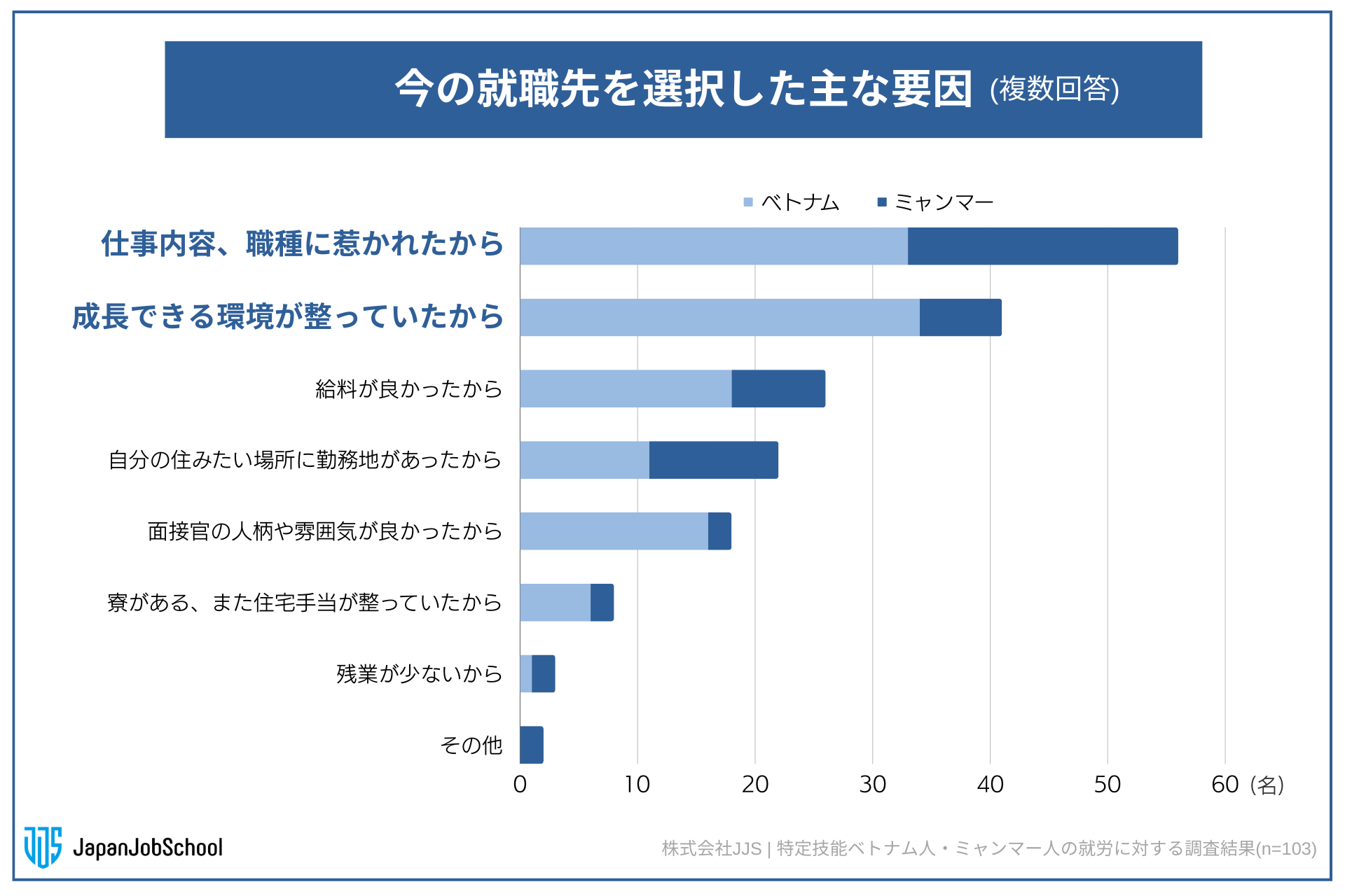 今の就職先を選択した主な要因を質問したところ(n=103)、「仕事内容、職種に惹かれたから」を選択した人が56名と最も多く、続いて「成長できる環境が整っていたから」と答えた人が41名だった。