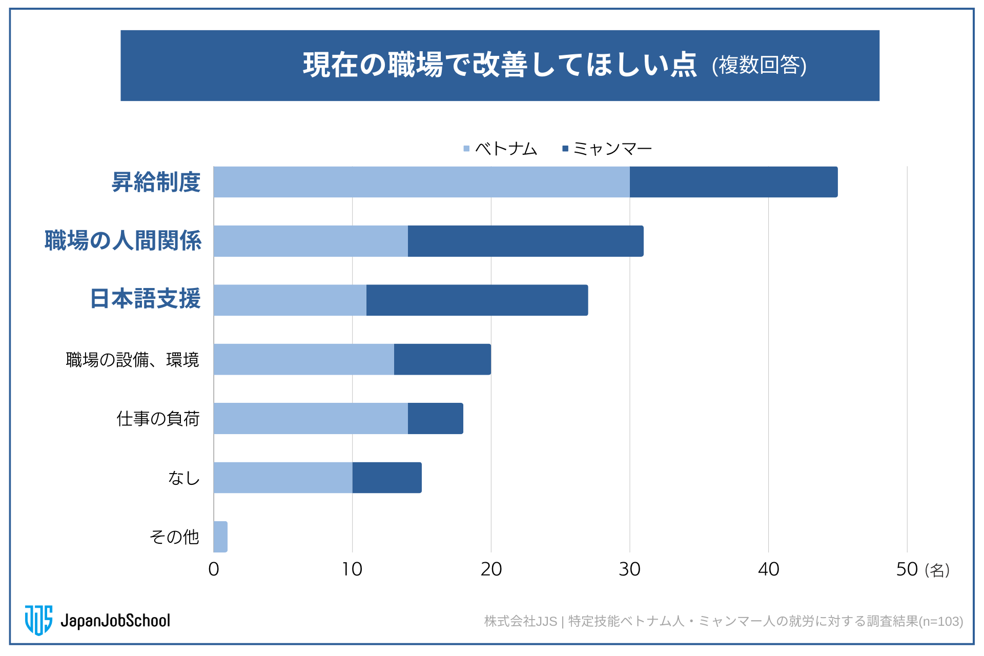 現在の職場で改善してほしい点を質問したところ(n=103)、「昇給制度」と答えた人が45名と最も多く、続いて「職場の人間関係」と答えた人が31名、「日本語支援」と答えた人が27名となった。