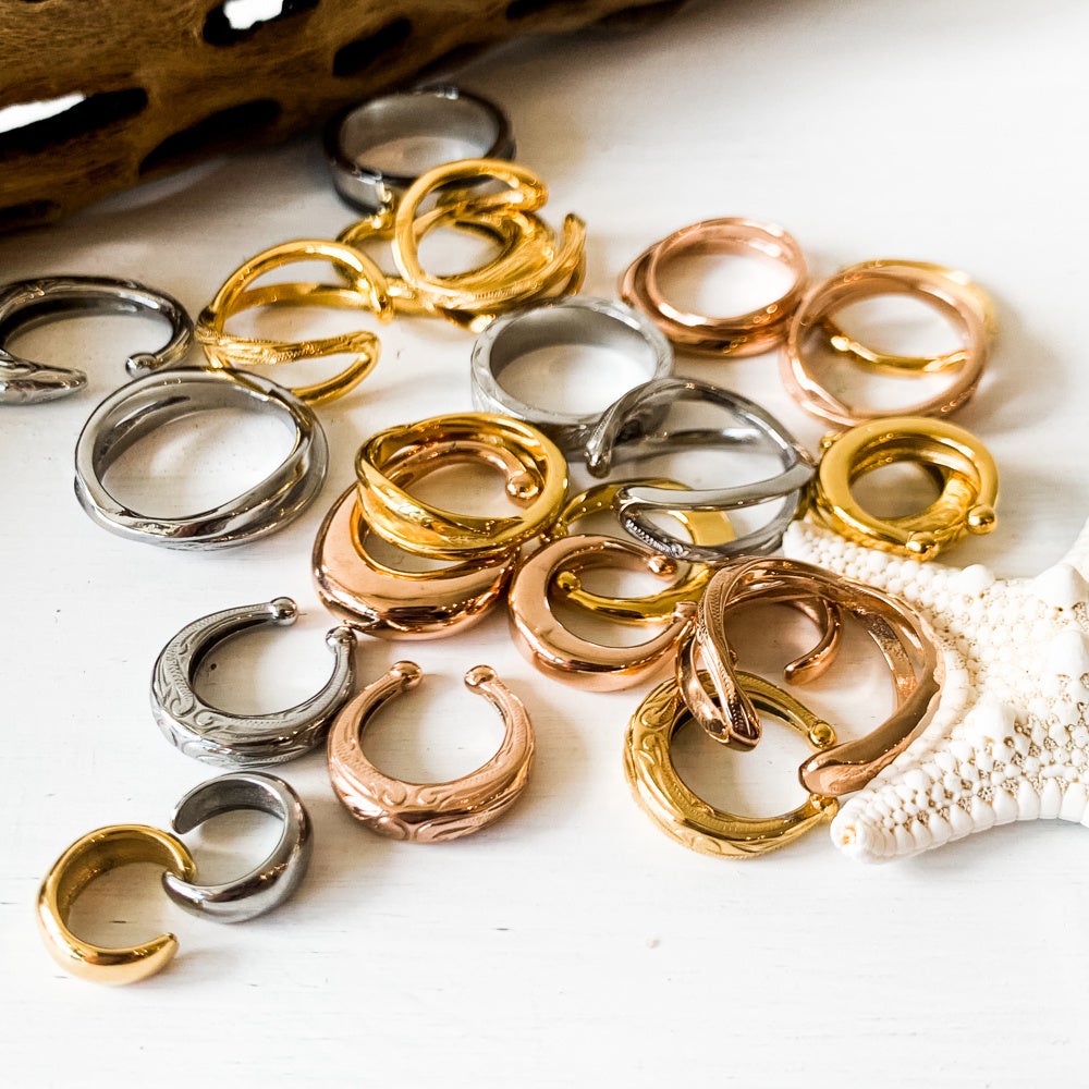 オープン時に取扱予定の商品は、大手ブランドと同じアクセサリーメーカーのラインで製造された316Lサージカルステンレス製ハワイアンジュエリーのアウトレット品のリングやイヤーカフです。
