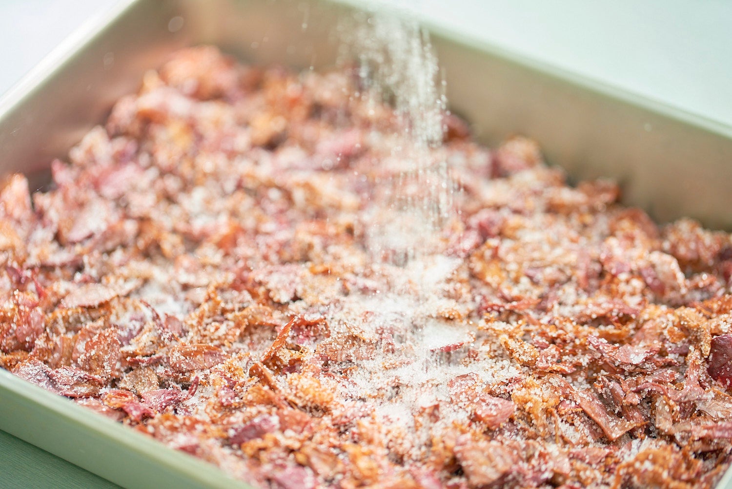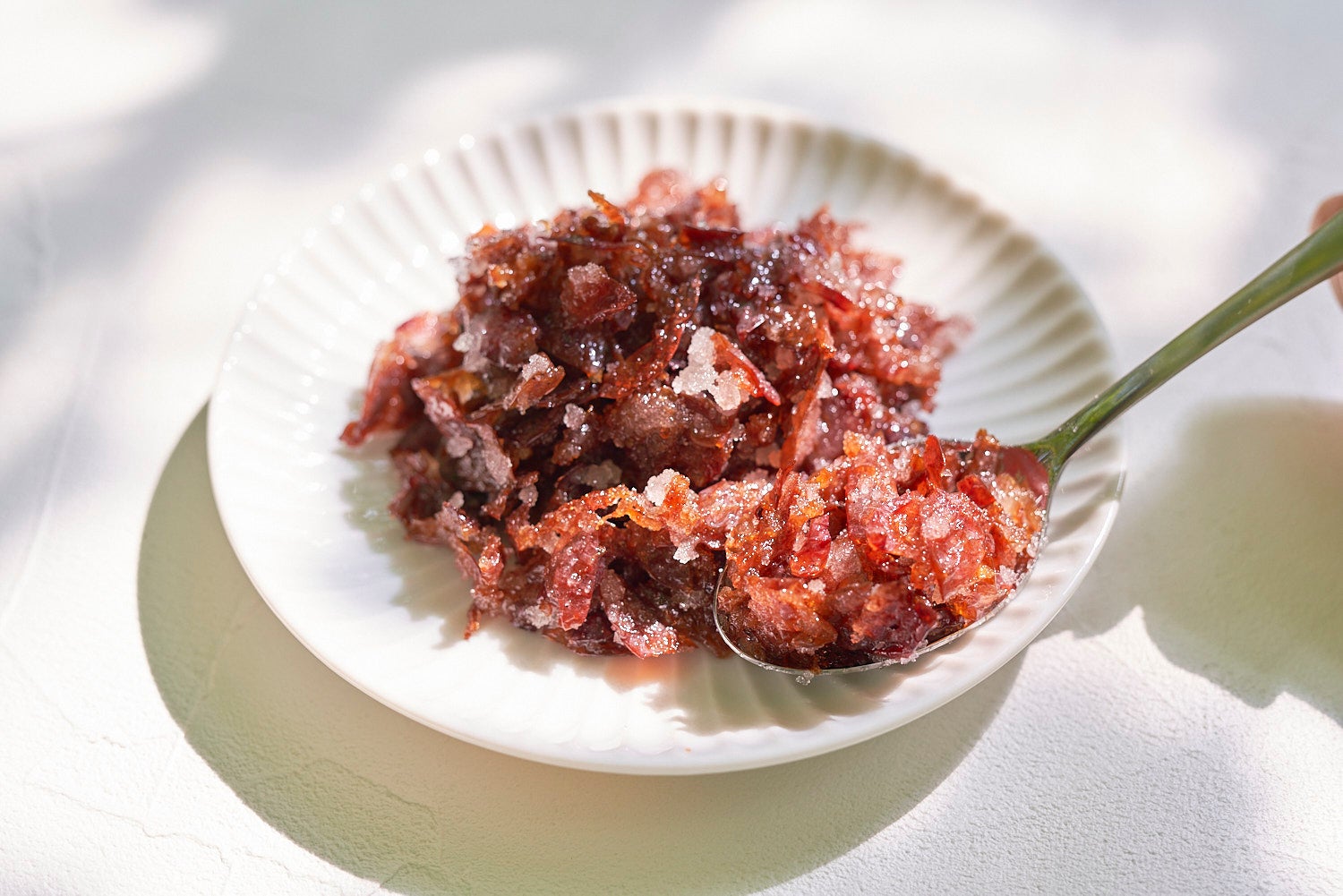 種と枝を取り除いた皮を一定期間砂糖漬けにすると、画像のような「ぶどうのワンピース」が完成するのです。