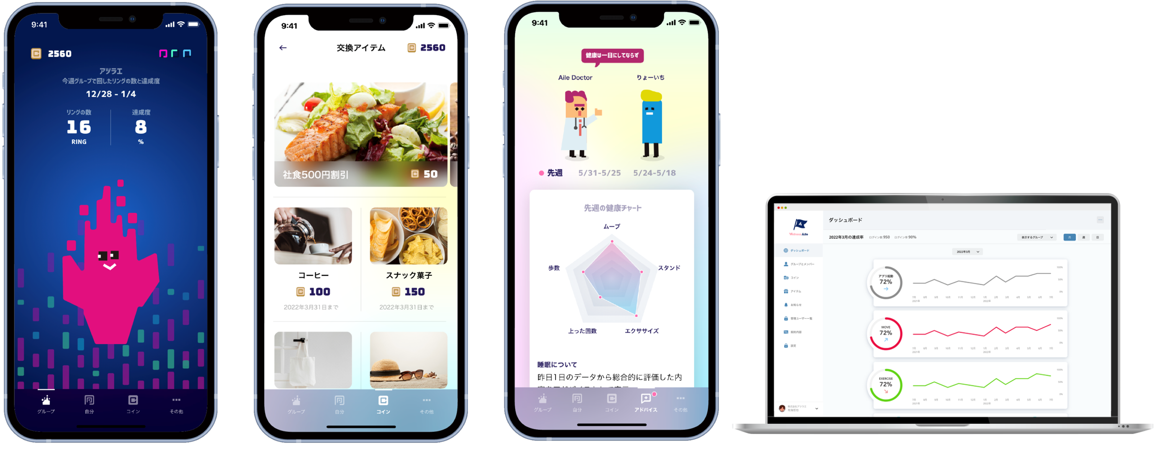 個人の活動量やグループでの目標など設定された目標をクリアすると、Wellness Aileオリジナルのコインを獲得できます。