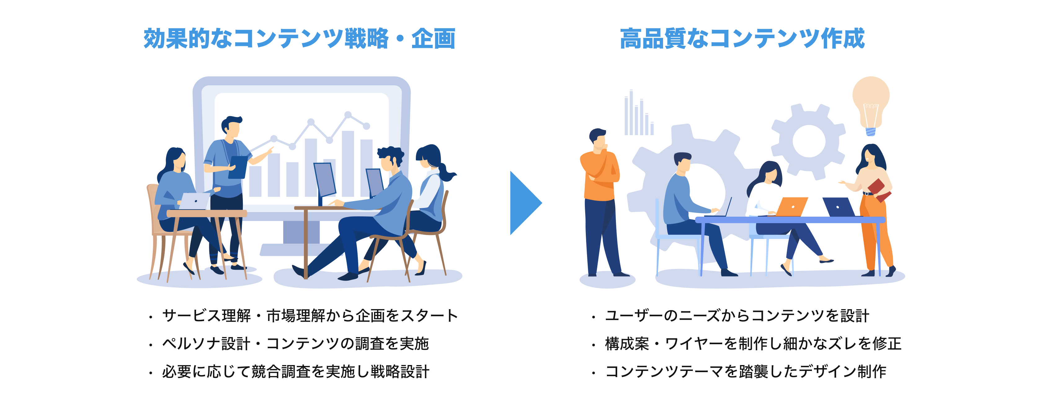 スゴシリョでは単純な制作代行ではなく上流設計から関わります。 サービス・ペルソナ理解からスタートし、エンドユーザーに効果的なコンテンツ戦略をゼロからご提案します。