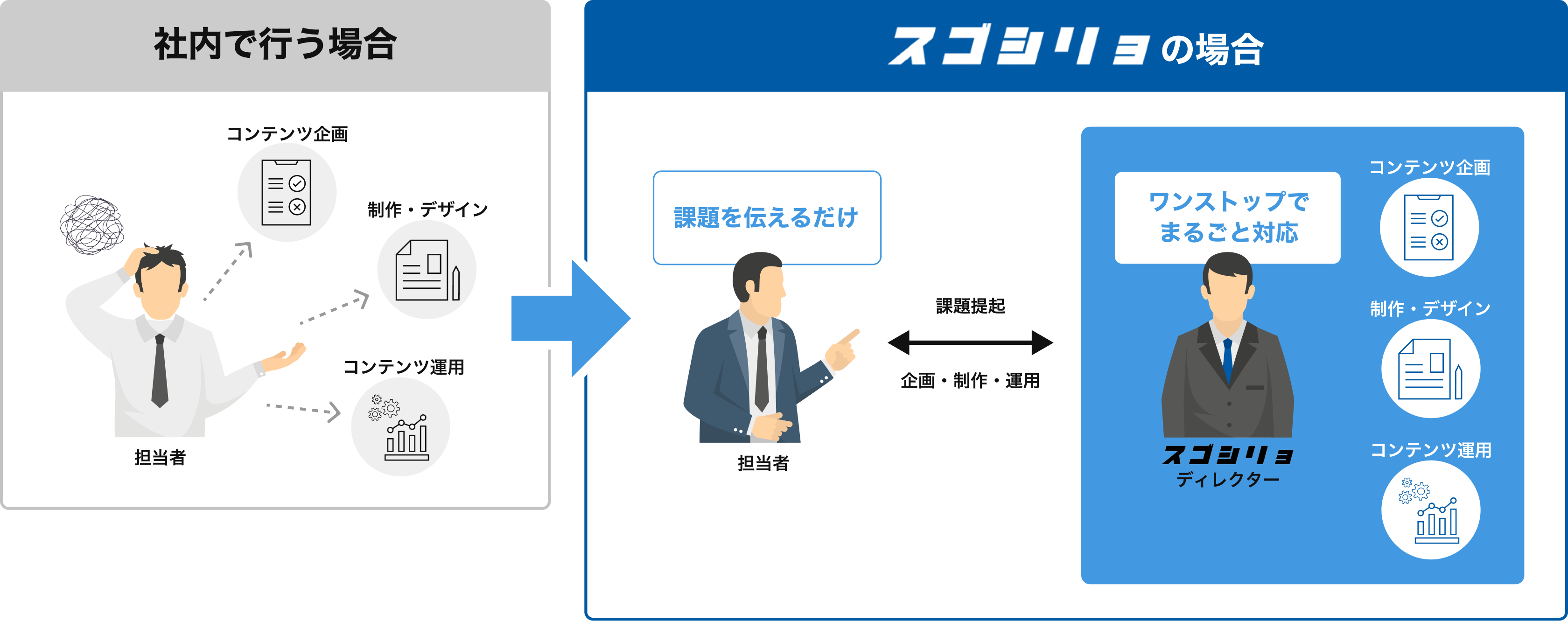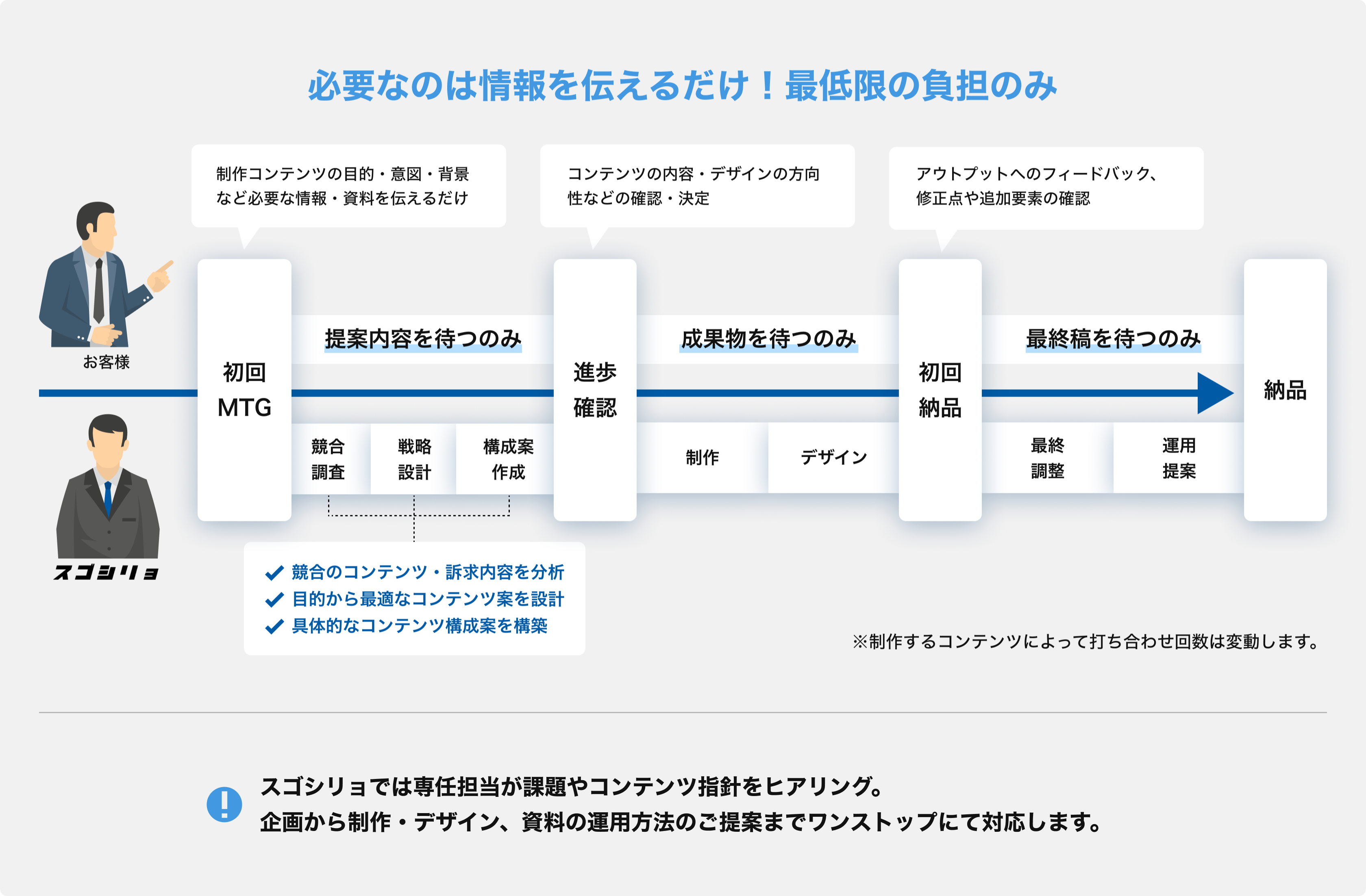 資料制作に関わる要件定義・企画・制作・運用提案まで全て「スゴシリョ」がワンストップでお引き受けいたします。