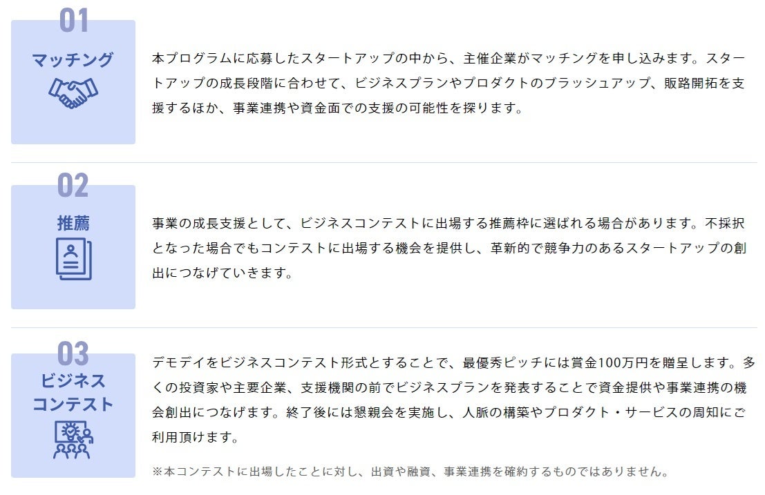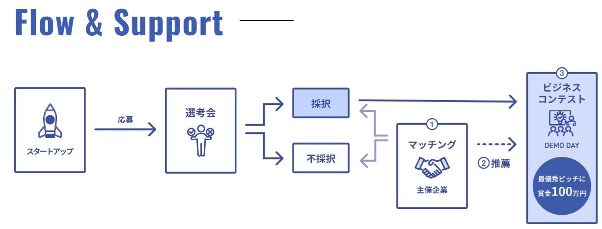 本プログラムに応募したスタートアップの中から、主催企業がマッチングを申し込み、ビジネスプランやプロダクトのブラッシュアップ、販路開拓を支援するほか、事業連携や資金面での支援の可能性を探ります。
