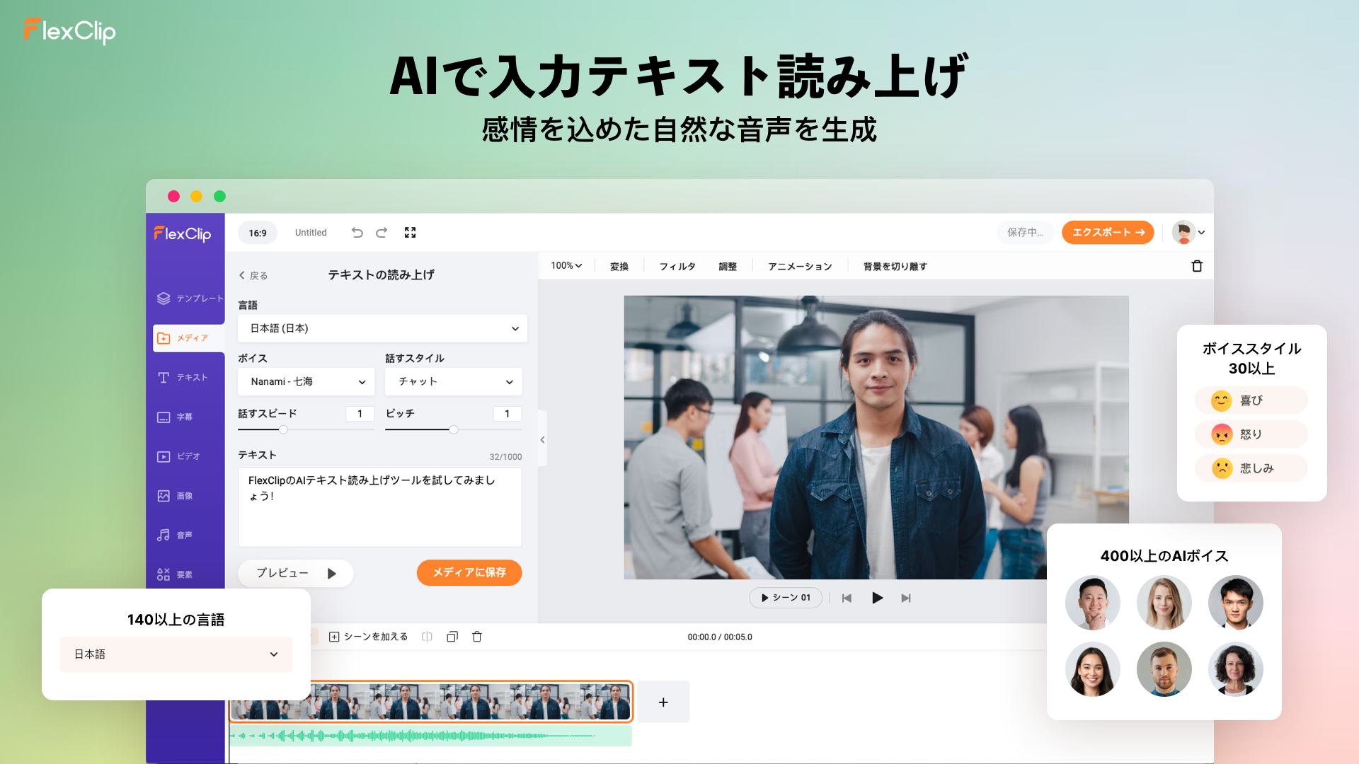 FlexClipの最新新バージョンには、新機能の「AIテキスト読み上げ」が含まれています。140以上の国や地域の言語をサポートし、400種類以上のAI音色を採用、より人間に近い自然な音を生成しています。また、30種類以上の感情色も用意されております。たったワンクリックで感情を込めた自然な音声の生成を実現します。
