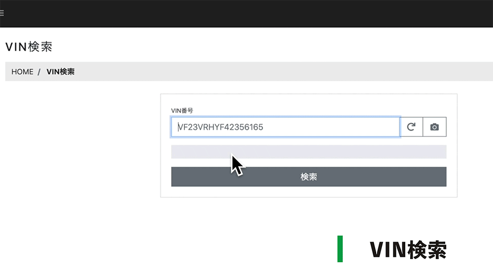 主に日本で流通する輸入車および海外で流通する日系車の車台番号(VIN番号)を入力するだけで、正確な車両情報、自動車補修部品(純正部品、汎用部品)情報を検索することができます。