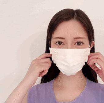 不織布マスクの鼻部分のワイヤーを押さえ、お顔にそうように装着します