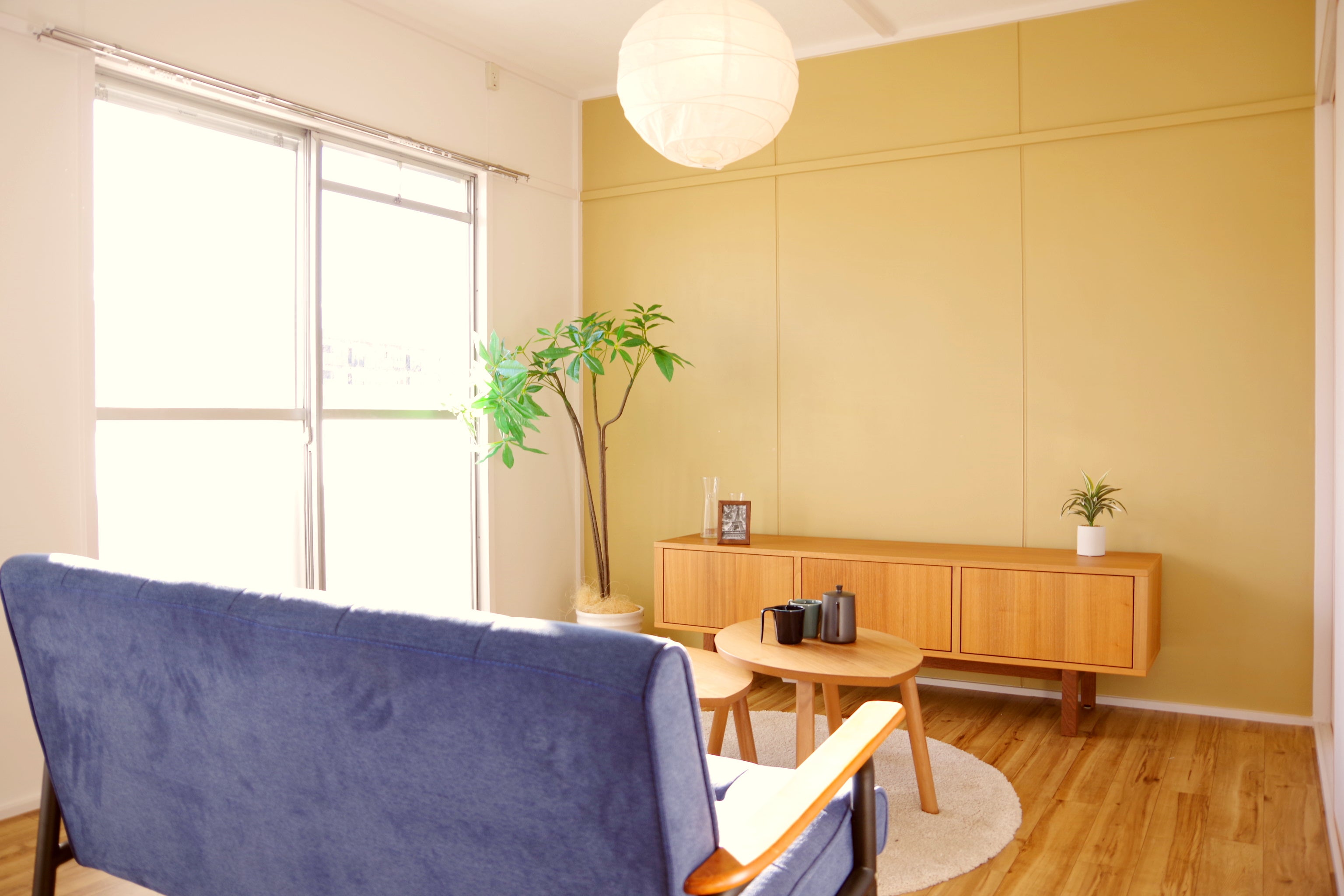 団地といえば昭和な古い内装・間取りをイメージしますが、部屋はペイントが映えるよう3DKから2LDKにリノベーションされています。あとは自分で選んだタカラ塗料オリジナルカラーで壁やふすまをペイントするだけでおしゃれな内装が完成します。選ぶ色によってシックにもモダンにも自分好みのお部屋にすることが可能です。