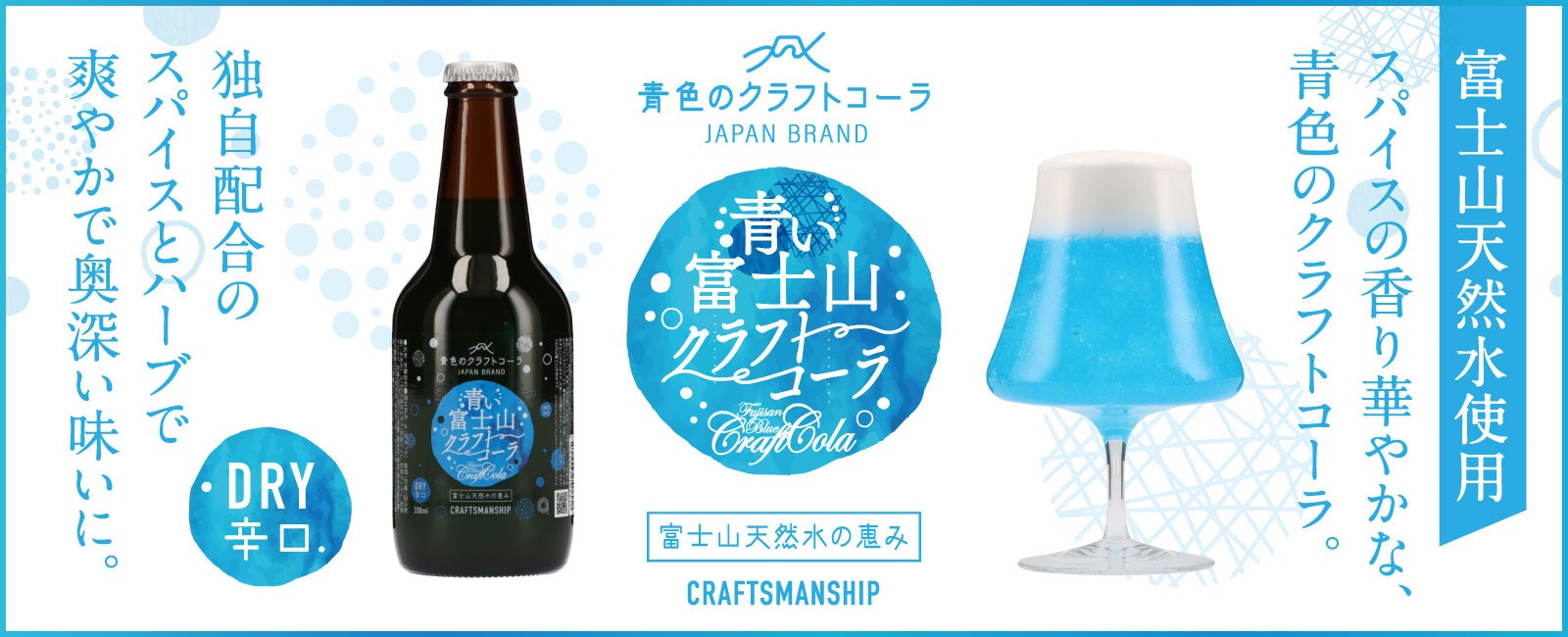 | 商品特徴 | 富士山の天然水を用いたクラフトコーラ。ブルーの液体に白い泡が美しく、ご自宅等でグラスに注ぐと、まるで雪を冠にいただいた富士山のようになる“青い飲み物”。 キレのある辛口でスパイスの華やかな香りと爽やかなハーブの香りによる甘さ控えめでスッキリとした大人向けのクラフトコーラ。 |