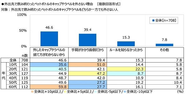 年代別にみると、10代では「手間がかかり面倒だから」(51.0%)、60代では「外したキャップやラベルの捨て方がわからないから」(59.8%)が他の年代と比べて特に高くなりました。