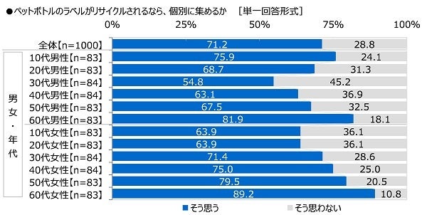 また、ペットボトルのラベルがリサイクルされるなら、個別に集めるかどうか聞いたところ、「そう思う」と回答した人の割合は71.2%となりました。
