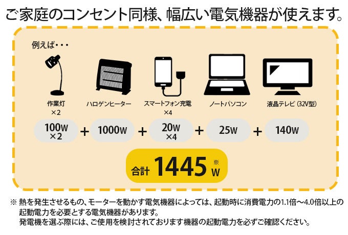 この度日本アクセスから発売された「AQ1700GB」は一般的な カセットガス発電機の定格出力(900w~1000w)を大きく上回る、定格出力「1500w」の高出力を実現いたしました。