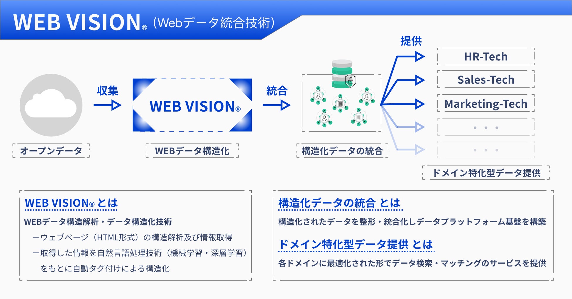 XAION DATAでは、「WEB VISION」を活用して、従来から参入しているHRやSales領域だけではなく、ドメイン特化の検索やデータアクセスの容易性を上げていき、さらなるデータ検索技術やそのマッチング精度の向上を加速させていきます。