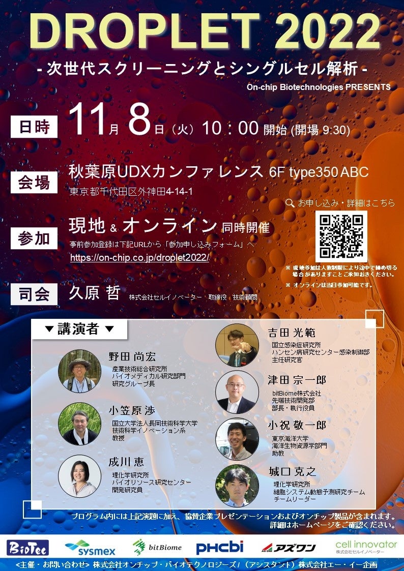 株式会社オンチップ・バイオテクノロジーズ(本社:東京都小金井市、代表取締役社長:小林雅之)は、令和4年11月8日(火)10:00(開場 9:30)から秋葉原UDXカンファレンスにて「DROPLET 2022」を開催いたします。オーガナイザーに株式会社セルイノベーター取締役技術顧問 久原哲先生をお招きして、7名の先生方にドロップレットを使用した最新の研究をお話し頂きます。
