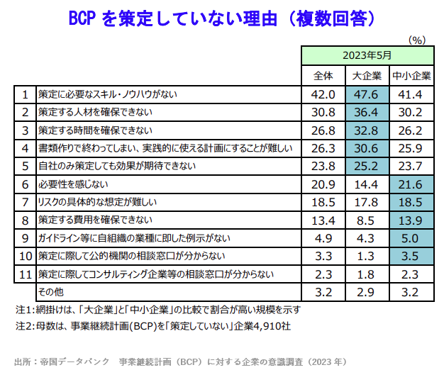 BCP策定が義務化されることで、各事業所はBCPの策定に取り組む必要が生じます。しかし、多くの事業所ではBCP策定に関する専門知識が不足しており、時間や費用の面での課題も抱えています。「策定意向あり」においては3年連続で5割を下回るなど、BCP策定の進捗率は低水準で推移している現状です。