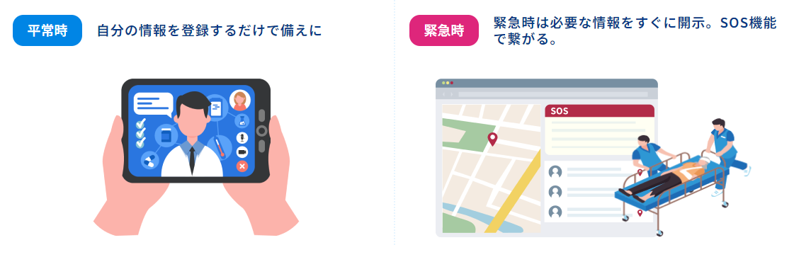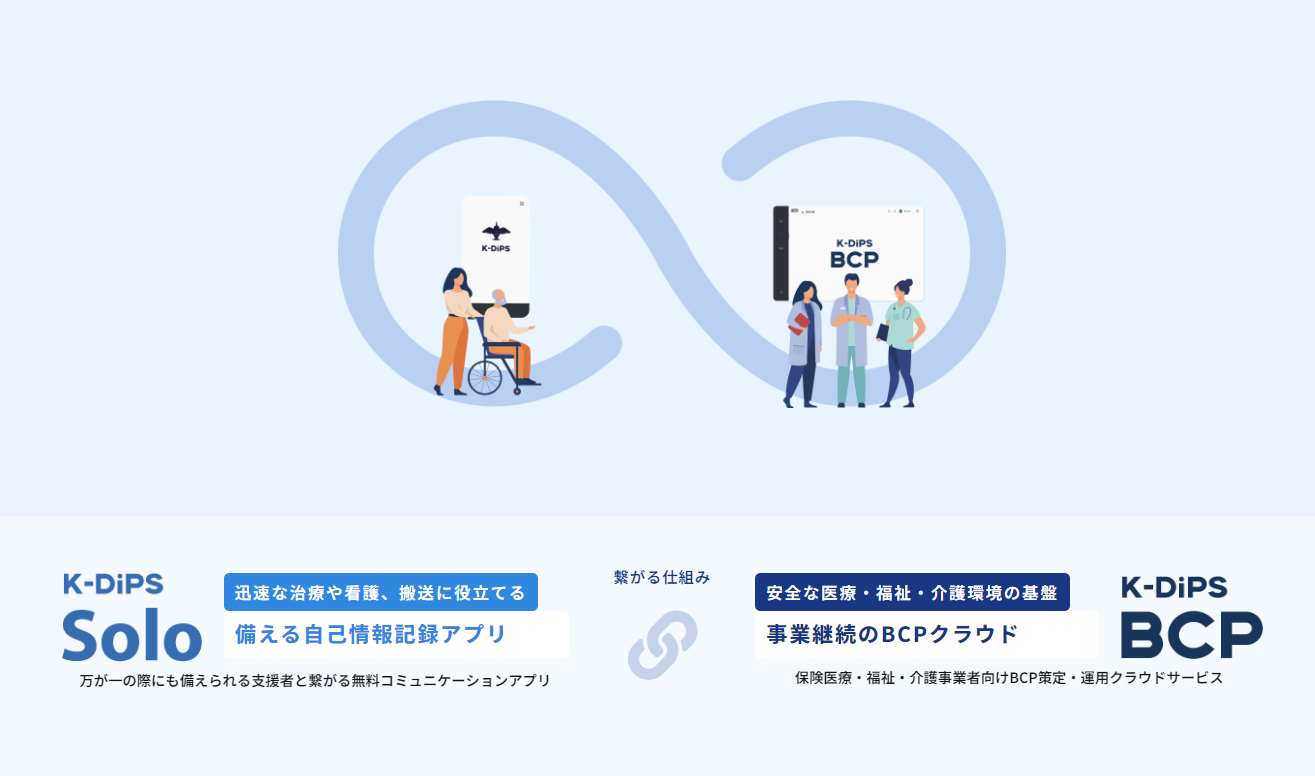 「K-DiPS BCP」は、自身の医療情報を記録できる無料アプリ「K-DiPS Solo(https://k-dips.jp/)」(2020年にリリース)と連携しています。災害時や非常時において、利用者と事業者がリアルタイムでつながる仕組みが提供されているので、安否確認機能やSOS機能を活用することが可能です。利用者は自身の医療情報を開示することで、迅速かつ適切なケアを受けることができます。事業者は、利用者の安否確認やSOS受信に迅速に対応し、職員同士で適切な行動を瞬時に判断することができます。