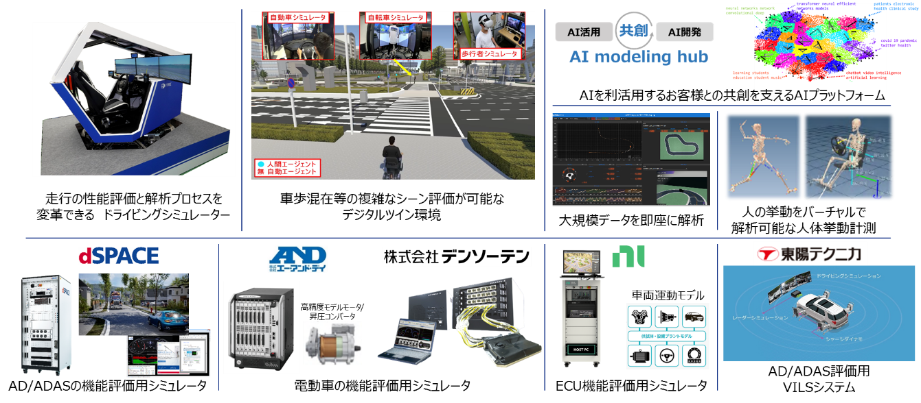 シミュレーション(MILS/SILS/HILS/VILS※1/Driving Simulator)環境をはじめ、目的にあったシミュレーションモデル、評価シナリオの自動生成等、多様なシミュレーションツールをつなぎ、最適な評価環境を提供いたします。さらに、最先端設備と技術ソリューションを取り揃えており、すぐにその場でトライすることが可能です。