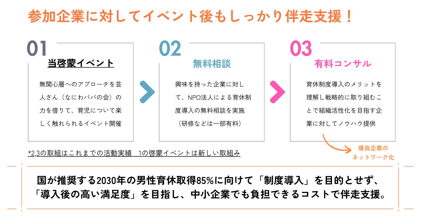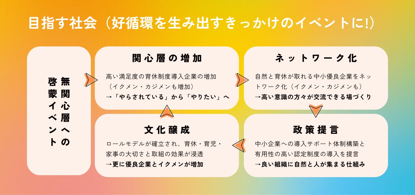 今回の啓蒙イベントは啓蒙にとどめず、その後も中小企業に育休制度の導入支援を実行していくこと、そして行政も巻き込んで大きな社会的な動きにしていくことで、初めて意義のあるものになると考えています。大きな流れを生み出すために少しでも多くの方にこの活動を認知して頂くことが肝要だと捉えていますので、メディアの皆さまにもお力添え頂けると本当に助かります。今回の取組が出生率の改善効果を生み、大阪発のロールモデルとなって、全国に波及していく状態を目指して精進していきます。