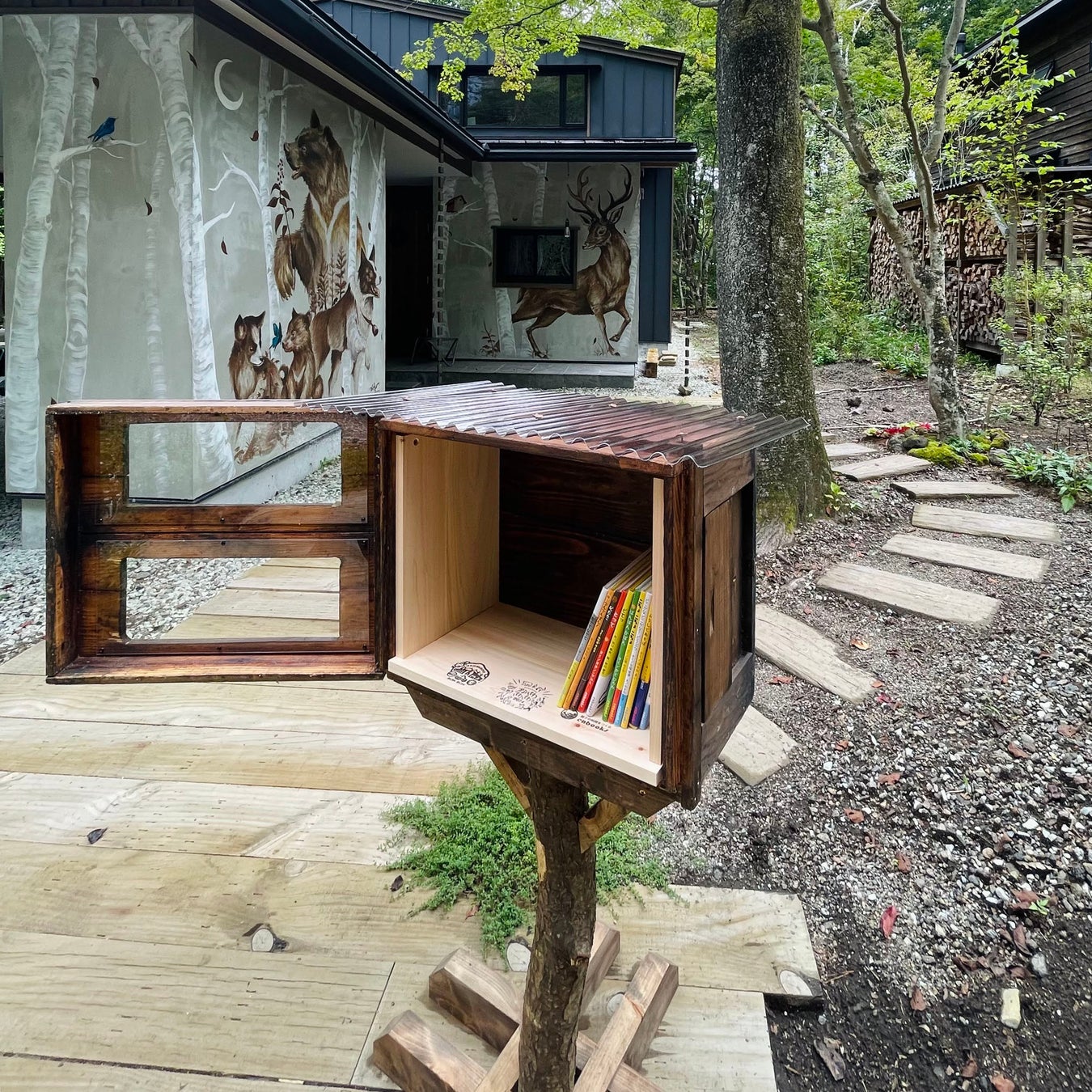 民家のベンチには、北軽井沢の「あさまのぶんぶんファクトリー」製作による本箱に絵本とそれぞれのオーナーが選んだ書籍を添えて、ベンチの脇に設置しました。