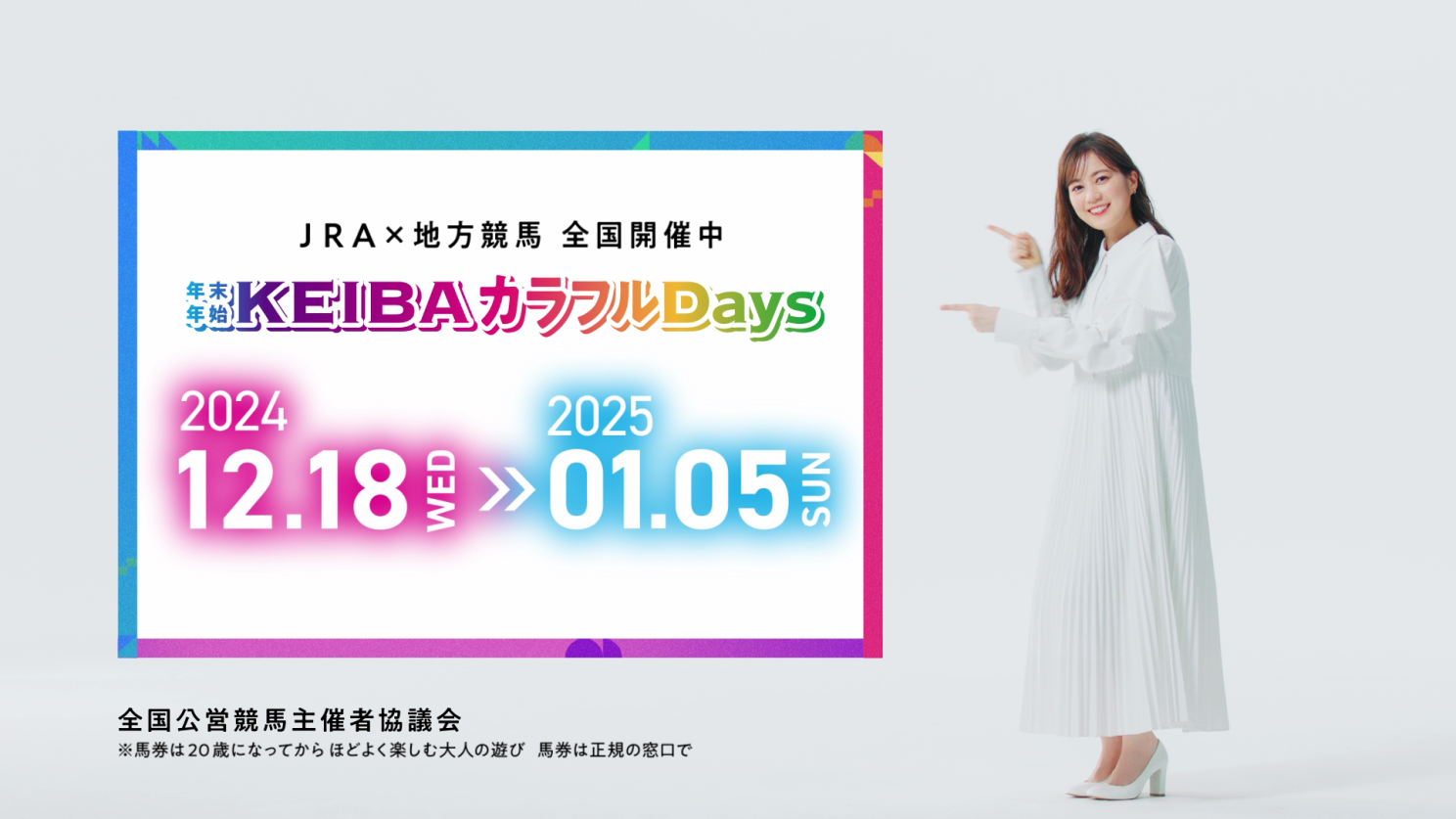 2024年12月18日(水)から2025年1月5日(日)の19日間は「JRA×地方競馬 KEIBAカラフルDAYS」と銘打ち、日本の競馬を支える「JRA」と「地方競馬」が年に一度きりのコラボを行い、注目レースが多数開催される年末年始期間を盛り上げます。イメージキャラクターには俳優の生田絵梨花さんを起用。出演するTVCMを、12月18日(水)より、関東/関西/名古屋/北海道/岩手/石川/高知/佐賀にて放映します。