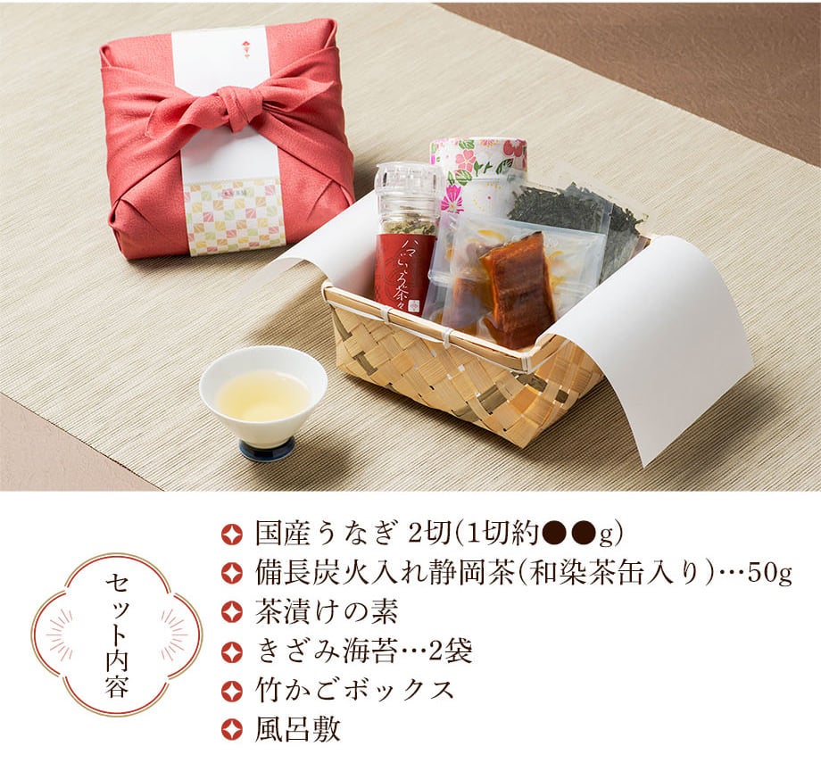 時間をかけてじっくりと炭火で火を入れる香り高い「備長炭火入れ静岡茶」(上品な和染の茶缶入り)、竹かごBOX、風呂敷がついたぜいたくなお茶漬けセットは、寒中見舞いや内祝い、誕生日祝い、自分へのご褒美や手みやげにもおすすめです。