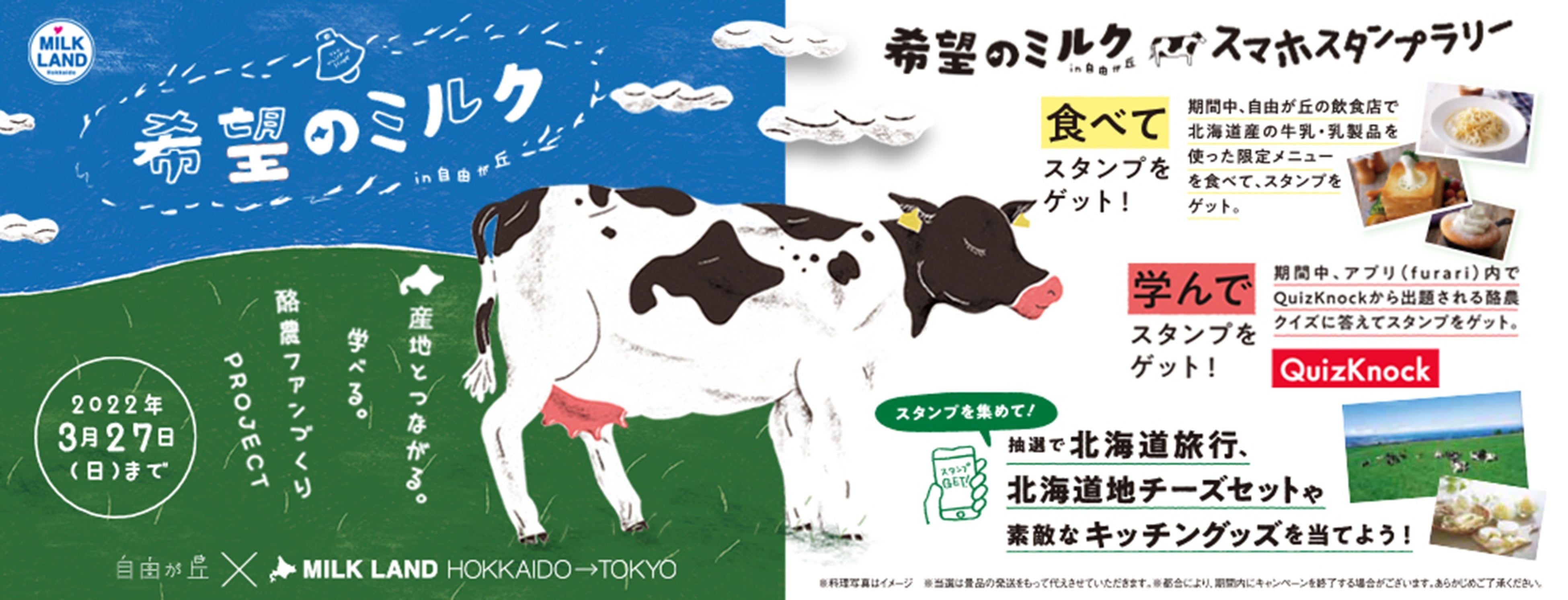 キャンペーンへの参加を通じて、北海道酪農の重要性を学んでいただくとともに、自由が丘エリアの各店舗で北海道産の牛乳・乳製品を使ったスペシャルメニューをご堪能ください。