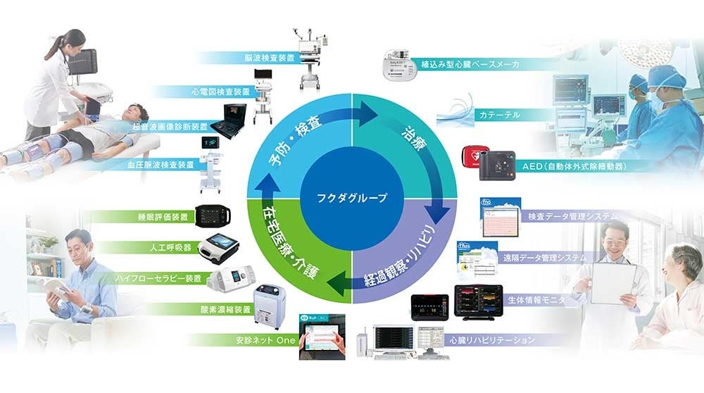 フクダ電子株式会社は1939年(昭和14年)の創業以来、国産心電計のトップメーカーとして歩み続け、予防・検査~経過観察・リハビリ~在宅医療までトータルソリューションを展開しております。