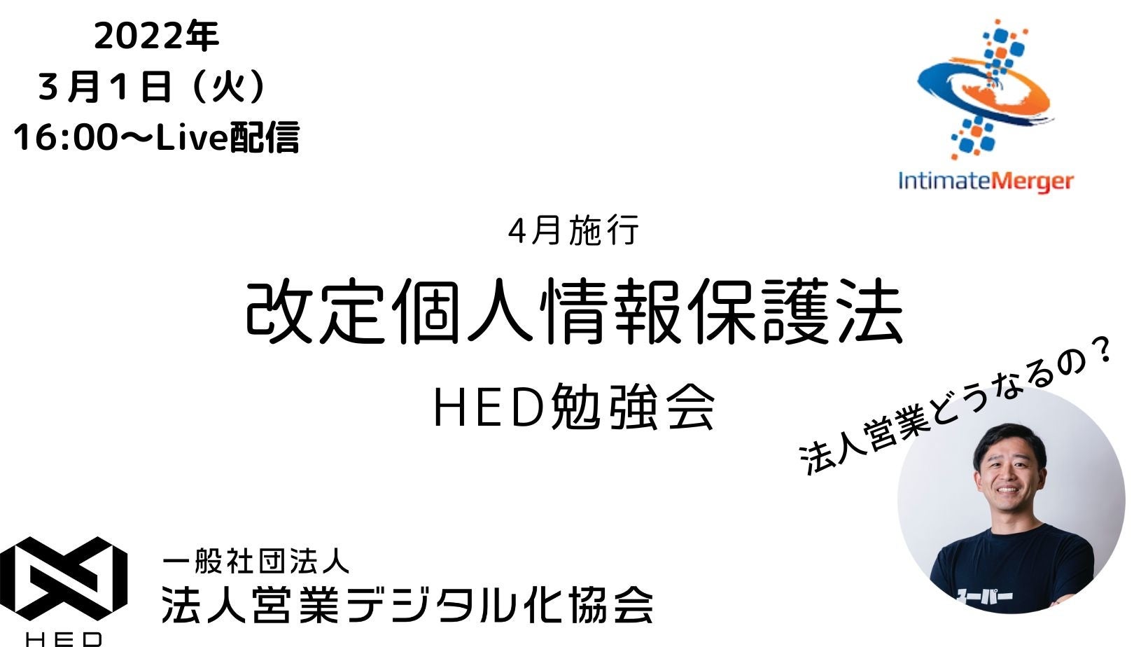 この度HEDは2022年4月に施行される個人情報保護法改正に、事業者がいかに対応すべきかを明らかにすることを目的に「HED個人情報保護法勉強会」を開催します。個人情報保護法改正に事業者、特に法人営業がどのような対応をすべきかの議論をおこない、消費者の個人情報の権利が守られる健全な営業活動を推進します。