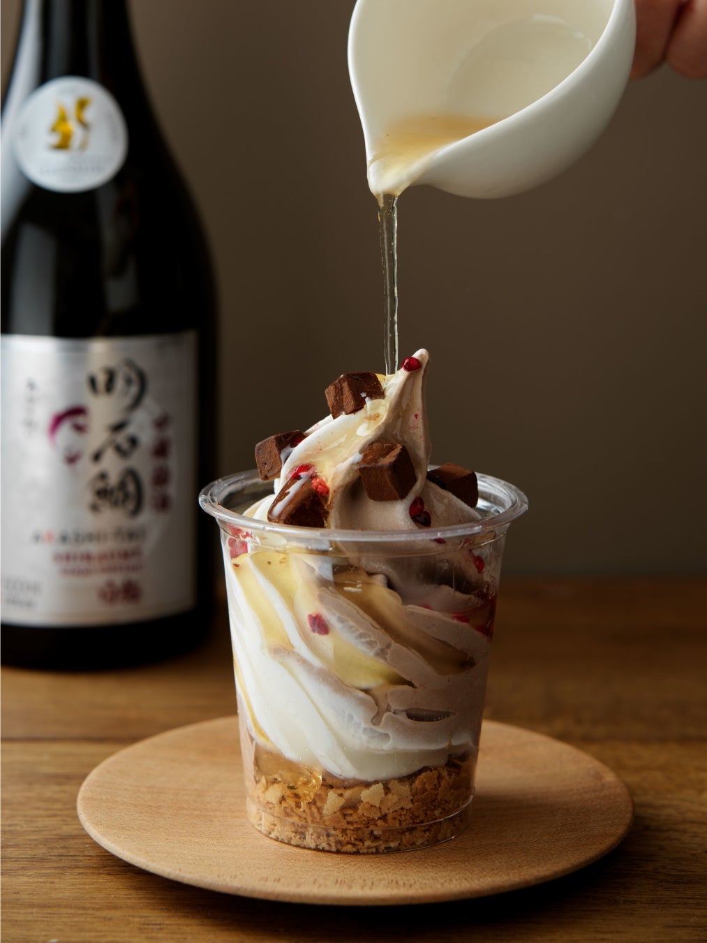 小樽洋菓子舗ルタオのまろやかなジャージーミルクとショコラのソフトクリームにとろりと濃厚な吟醸梅酒のマリアージュ