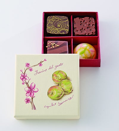 明石酒類醸造の「明石鯛 吟醸梅酒白梅」をはじめ、4つの蔵元の梅酒やリキュールとコラボレーションした限定チョコレートセット。イタリアのショコラティエ、ユミコ サイムラが、日本の果実酒の魅力を活かして生み出しました。