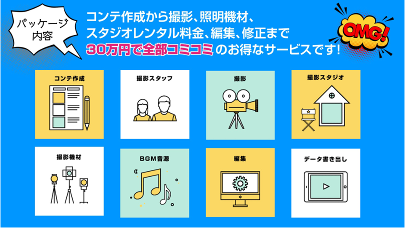 (※パッケージには、撮影スタッフ、撮影、撮影スタジオ、機材に関しては1日分、BGM音源に関しては当社からのご提案によるロイヤリティーフリー音源の費用、編集に関しては3分以内の動画、1作品あたりの編集費用が含まれます。)