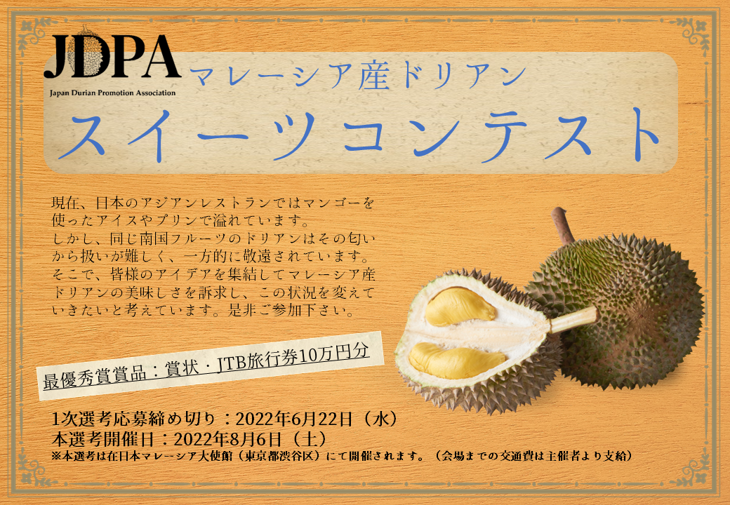 日本ドリアン普及協会と在日本マレーシア大使館主催のマレーシア産ドリアンスイーツコンテストが開催されます。現在、参加者を募集中です。
