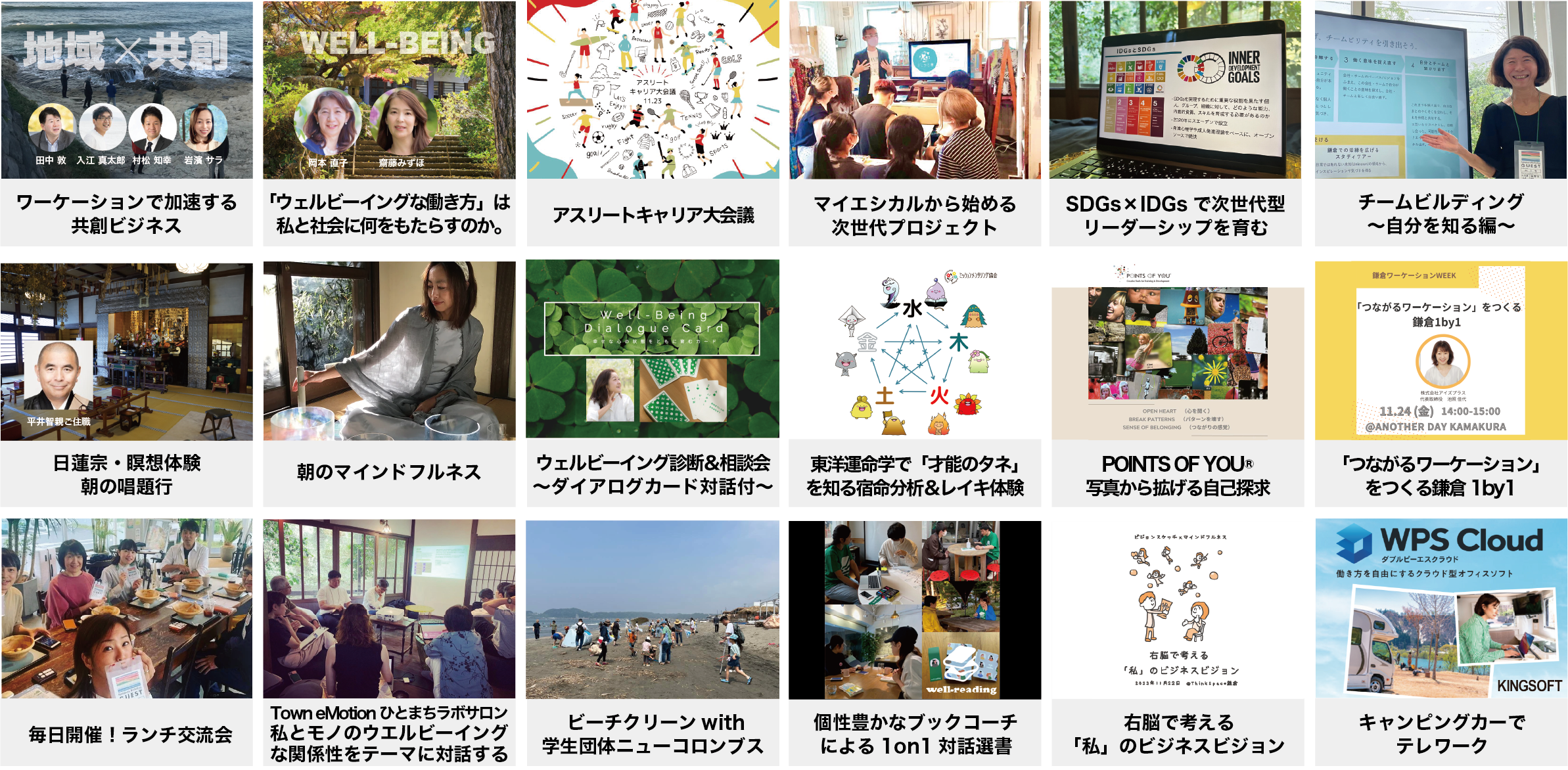 お寺・古民家・キャンピングカー・エシカルショップなど鎌倉ならではのワークスペース13箇所を巡りながらクリエイティブに仕事をしたり、ランチ交流会・瞑想体験・ビーチクリーン・チームビルディングなどの多様なプログラムに参加しながら、「ウェルビーイングな働き方」を実践できます。