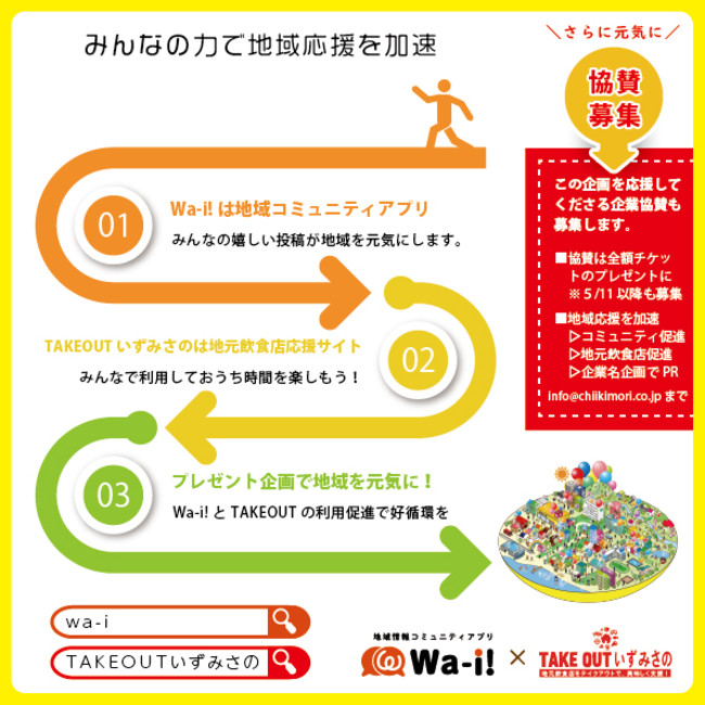 緊急事態宣言で厳しくなる飲食店を中心とする地域経済を応援するため、TAKEOUTいずみさの共通チケットを活用し、地域情報コミュニティアプリWa-i!(2021年2月泉佐野市でリリース)で地域コミュニティを活発にし、地域を元気にする企画です。