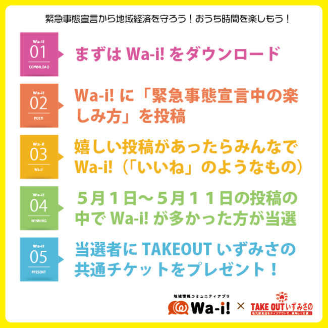 Wa-i!に「緊急事態宣言中の楽しみ方」(美味しかったテイクアウト情報やおうちで楽しめることなど)を投稿し、最も多くのWa-i!が付いた投稿をされた方にTAKEOUTいずみさの共通チケットをプレゼントします。