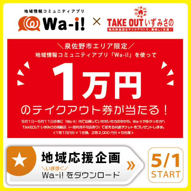 【泉佐野市でコロナ禍の地元飲食店を応援】地域情報コミュニティアプリ「Wa-i!」がTAKEOUTいずみさのと連携し、テイクアウトチケットプレゼントキャンペーンを実施