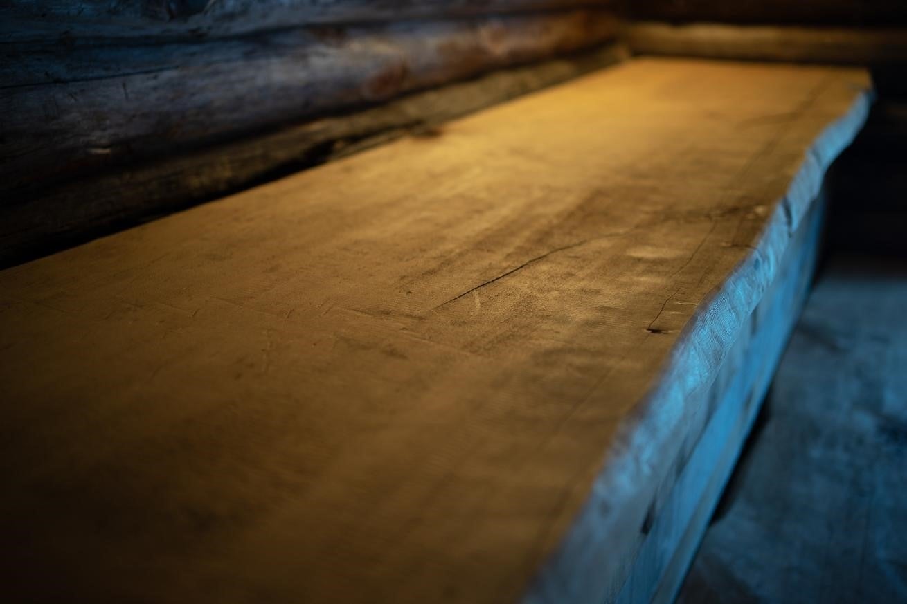 サウナ室内最大の特徴は、一枚板を丁寧に磨きあげたベンチ。