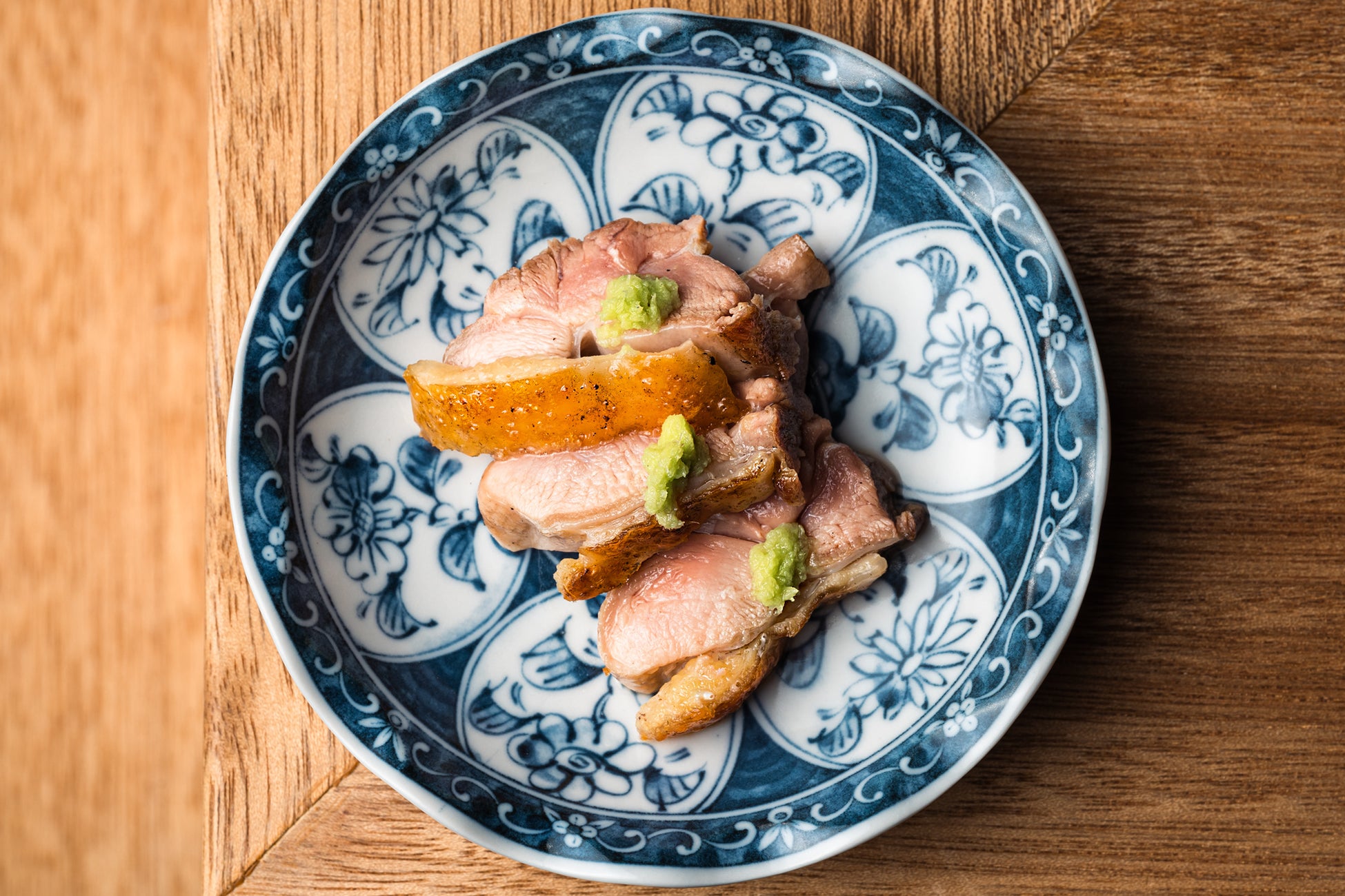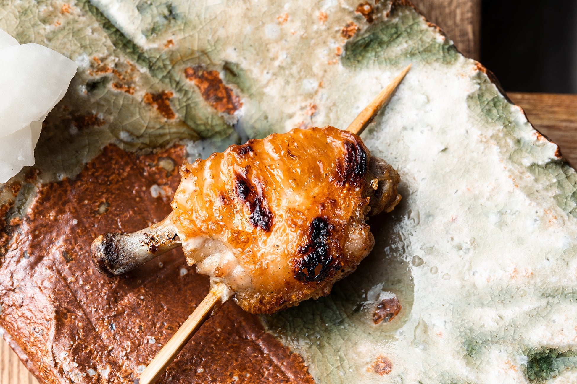 焼鳥には「大和肉鶏」や「但馬すこやかどり」などを使用。味わいの濃い地鶏やプリッとジューシーな若鶏などを織り交ぜながら、焼き加減を見極めて一串ずつ提供します。箸休めには神戸市兵庫区・マルシン市場内にある「中村漬物」のべったら漬けや自家製の浅漬けを。コースを通して、飽きのこない緩急のある味わいを表現します。