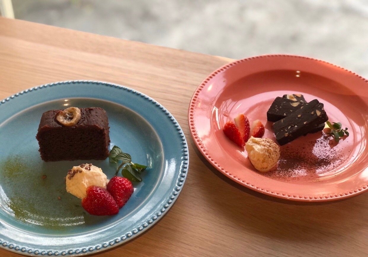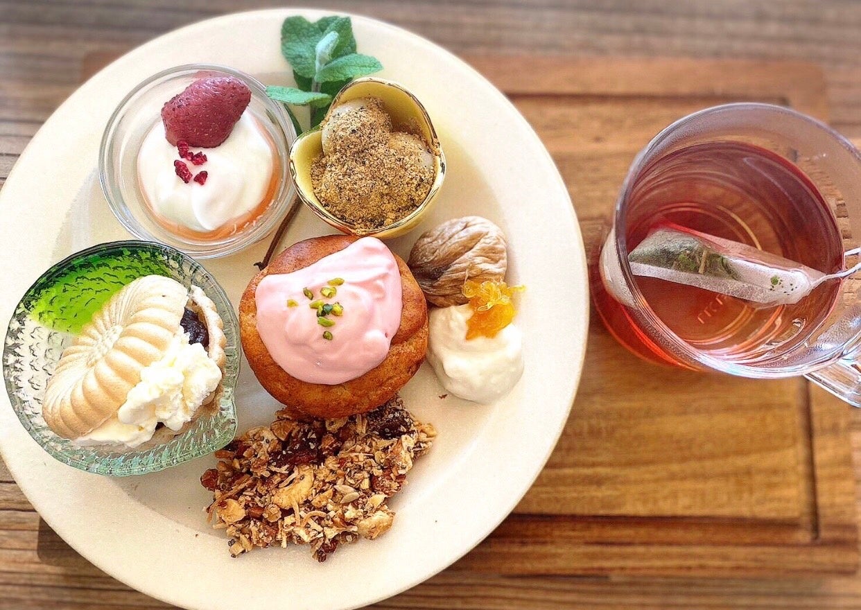薬草BARのアフタヌーンティーの他、定番の米粉のチョコバナナケーキ、ブリスボード、パフェ、冷やし白玉ぜんざい、オートミールクッキーなどをご用意。