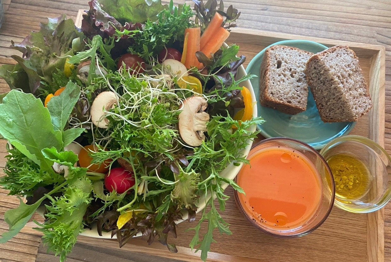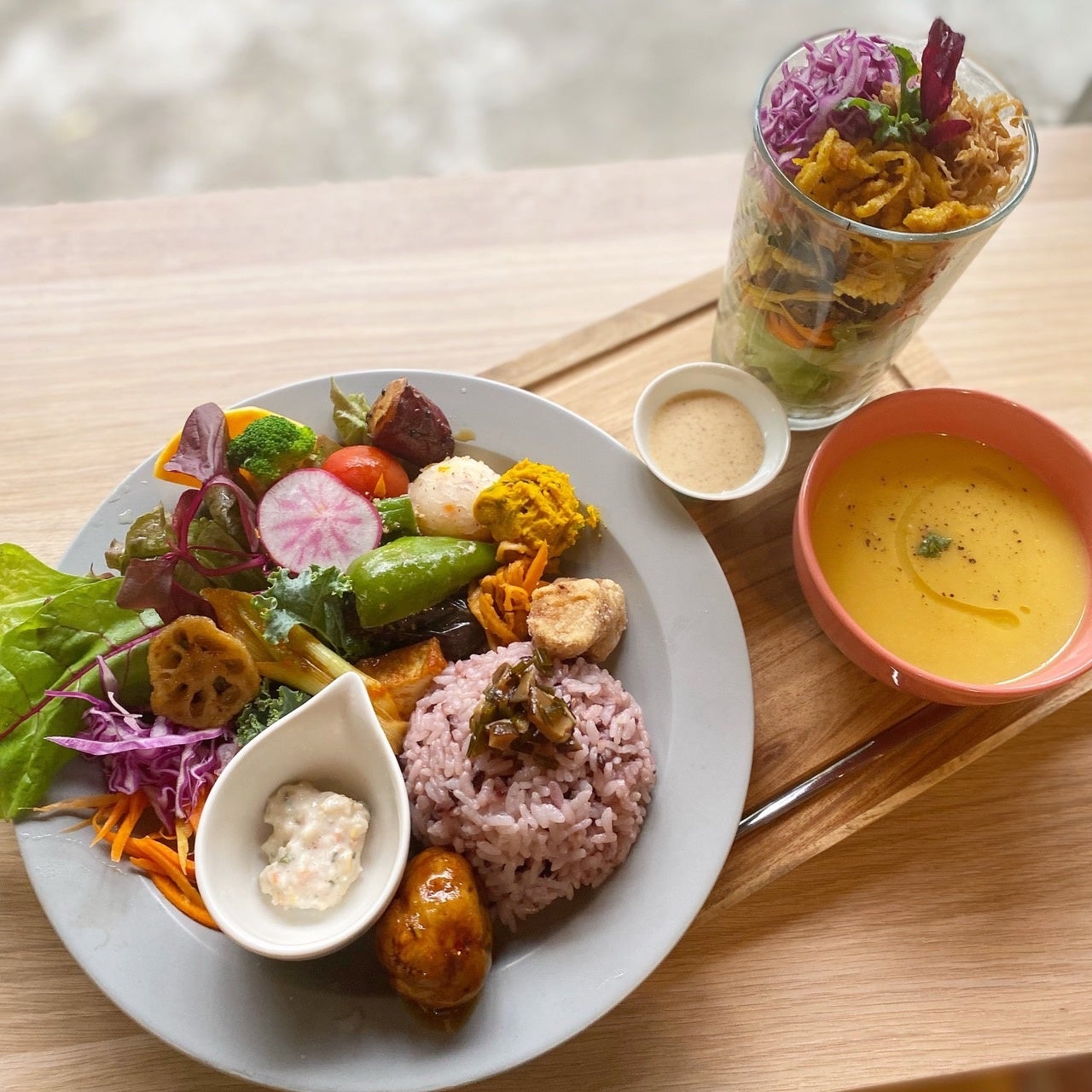 看板メニューの季節のお野菜をたっぷり使った目でも楽しめる美しいグラスアートのブッダボウルやカレープレートはそのまま、新たに、毎日焼き上げるフォカッチャ付きサラダプレートもご用意いたしました。
