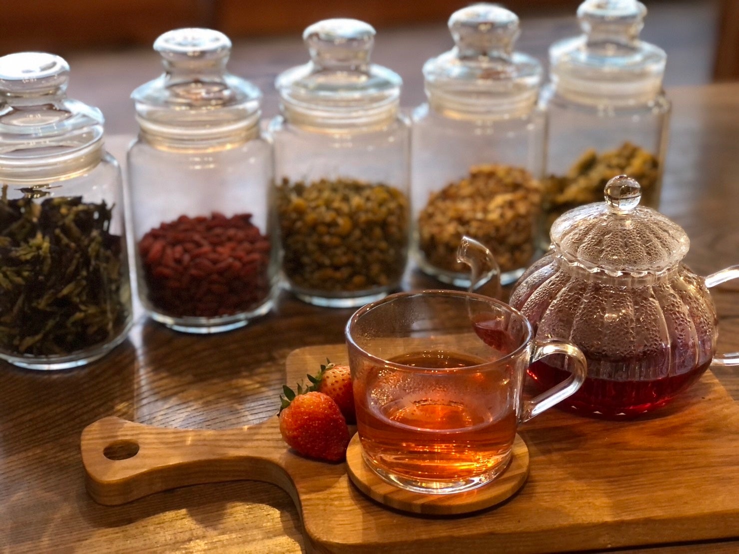 15:00-18:00のカフェタイムには飲み放題1,500円(ミニデザート付き)で利用できます。薬草BAR付きアフタヌーンティー3,300円もご用意し、ヘルスコンシャスなカフェ時間をのんびりと楽しんでいただけるようになりました。