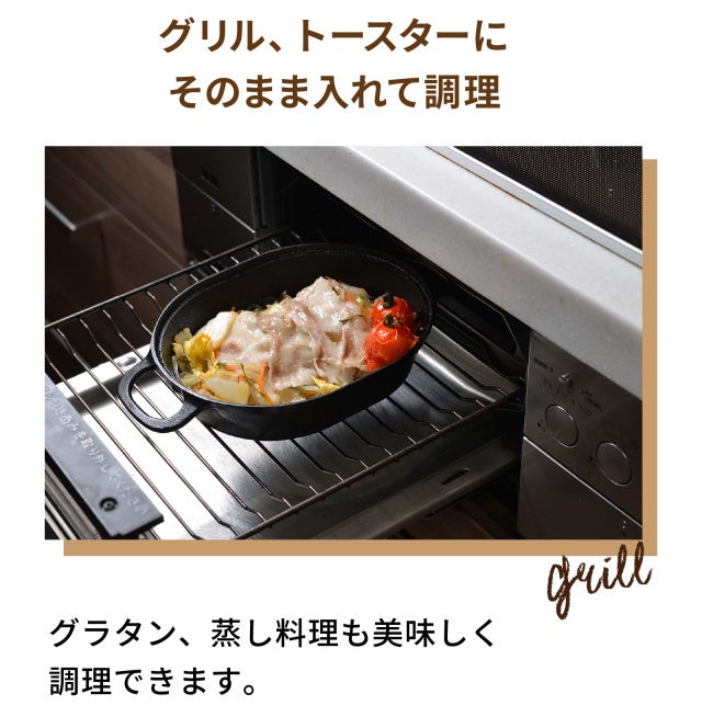 お客様の声から生まれた「薄型」ダッチオーブンは「オーブントースター」「魚焼きグリル」にそのまま入れて調理できるサイズです。
