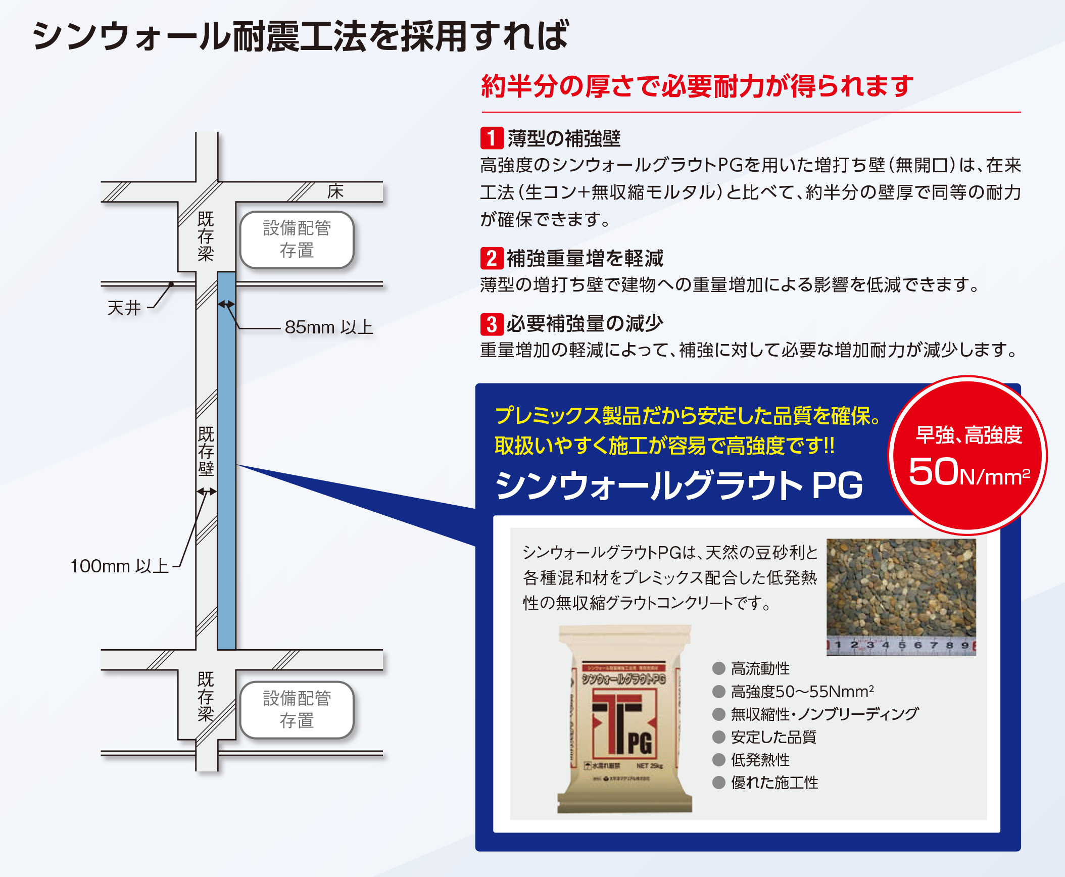 課題を有するこれら建物の耐震化を目的として、構造設計耐震診断・耐震補強工事等を行うリーテックと太平洋マテリアルは、新たに開発したプレミックス型の高強度無収縮グラウトコンクリート「シンウォールグラウトPG」(荷姿:25kg/袋)を用いた省力化耐震補強工法『シンウォール耐震工法」を開発しました。