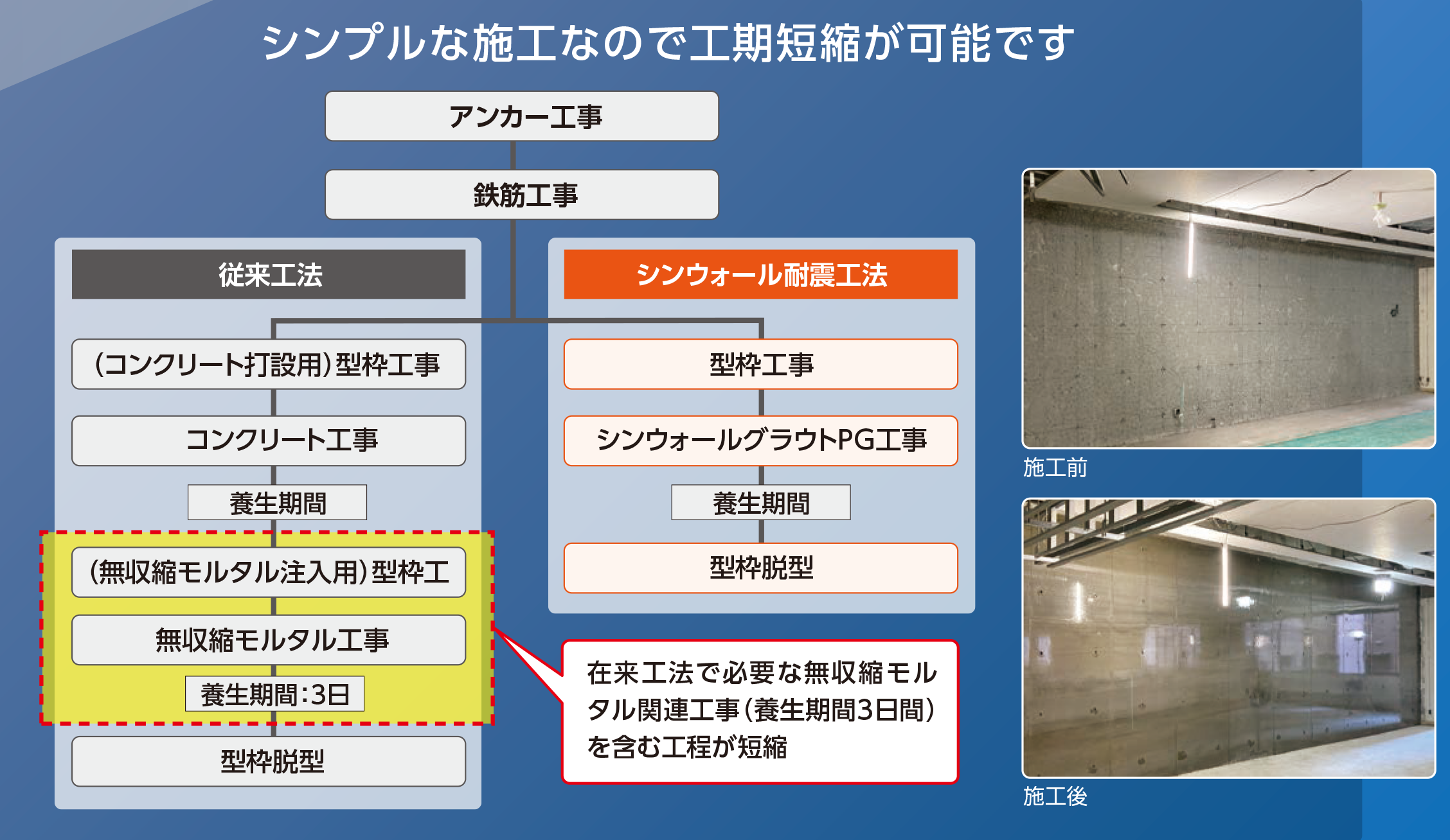 太平洋マテリアル社が新工法用に開発した「シンウォールグラウトPG」(低発熱型高強度無収縮系グラウトコンクリート)を用いる事で在来工法では必要であった無収縮モルタルによる再注入は不要となり、プレミックスタイプの採用によって、現場施工であっても安定した品質を提供する事が可能となっています。
