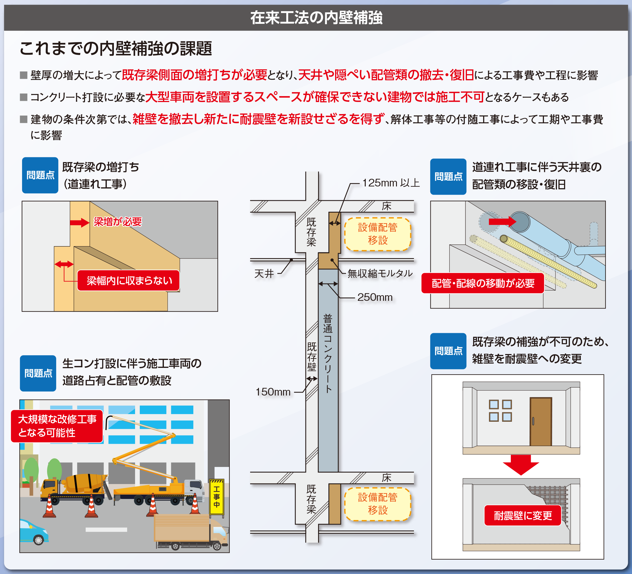 RC 壁の増打ち補強工法は、建物の保有水平耐力の向上が容易に図れる標準的な補強方法です。スパン数の多い建物桁行(⾧手)方向に比べ、スパン数の少ない梁間(短手)方向では、内壁を補強対象とせざるを得ず、増打ち補強工法の採用が標準となっています。これら内壁の増打ち補強工法では梁幅が小さい場合、必要な補強厚が確保できず、梁幅を拡大してから壁の増打ちを行う必要があり、天井や配管類の撤去、復旧といった工事が別途必要となり、補強設計の課題となっています。