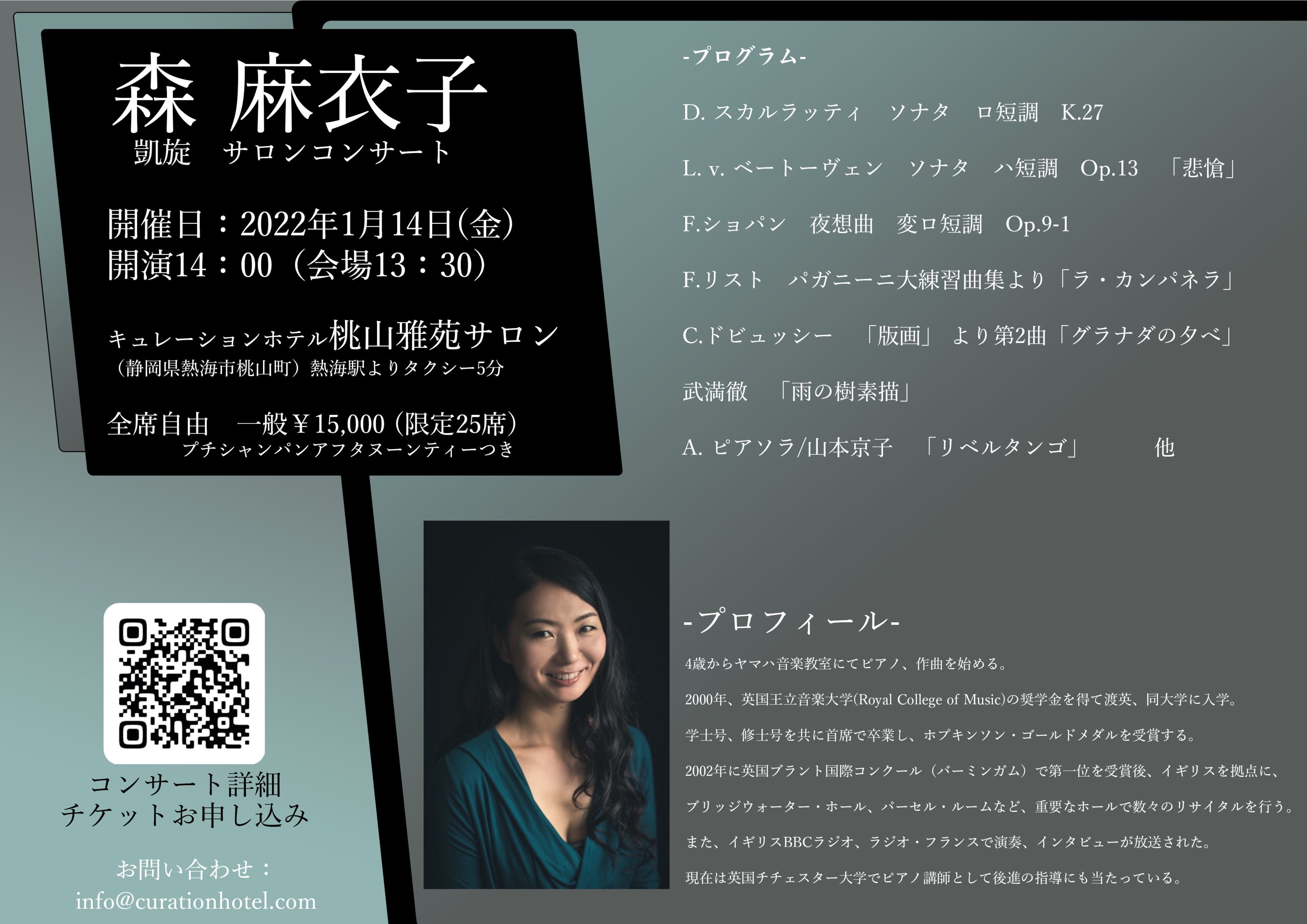 英国で活躍中のピアニスト森麻衣子が凱旋にて、キュレーションホテル桃山雅苑にてサロンコンサート
