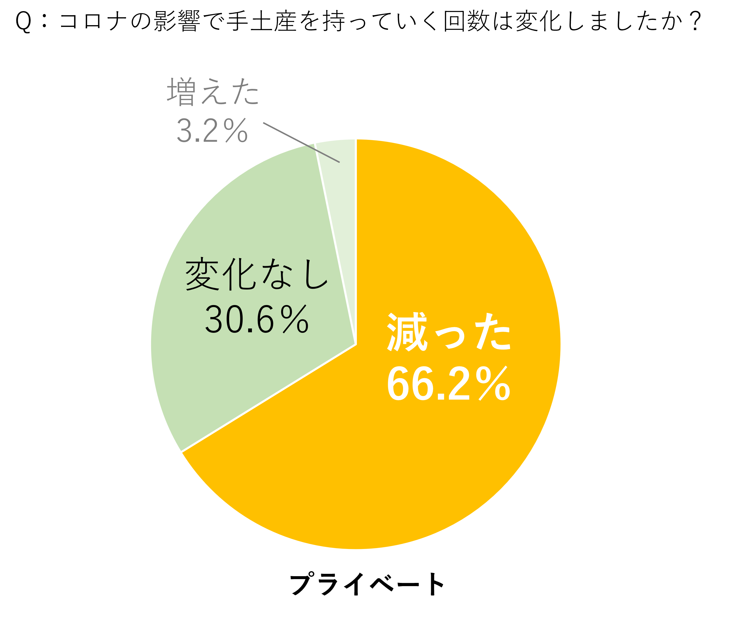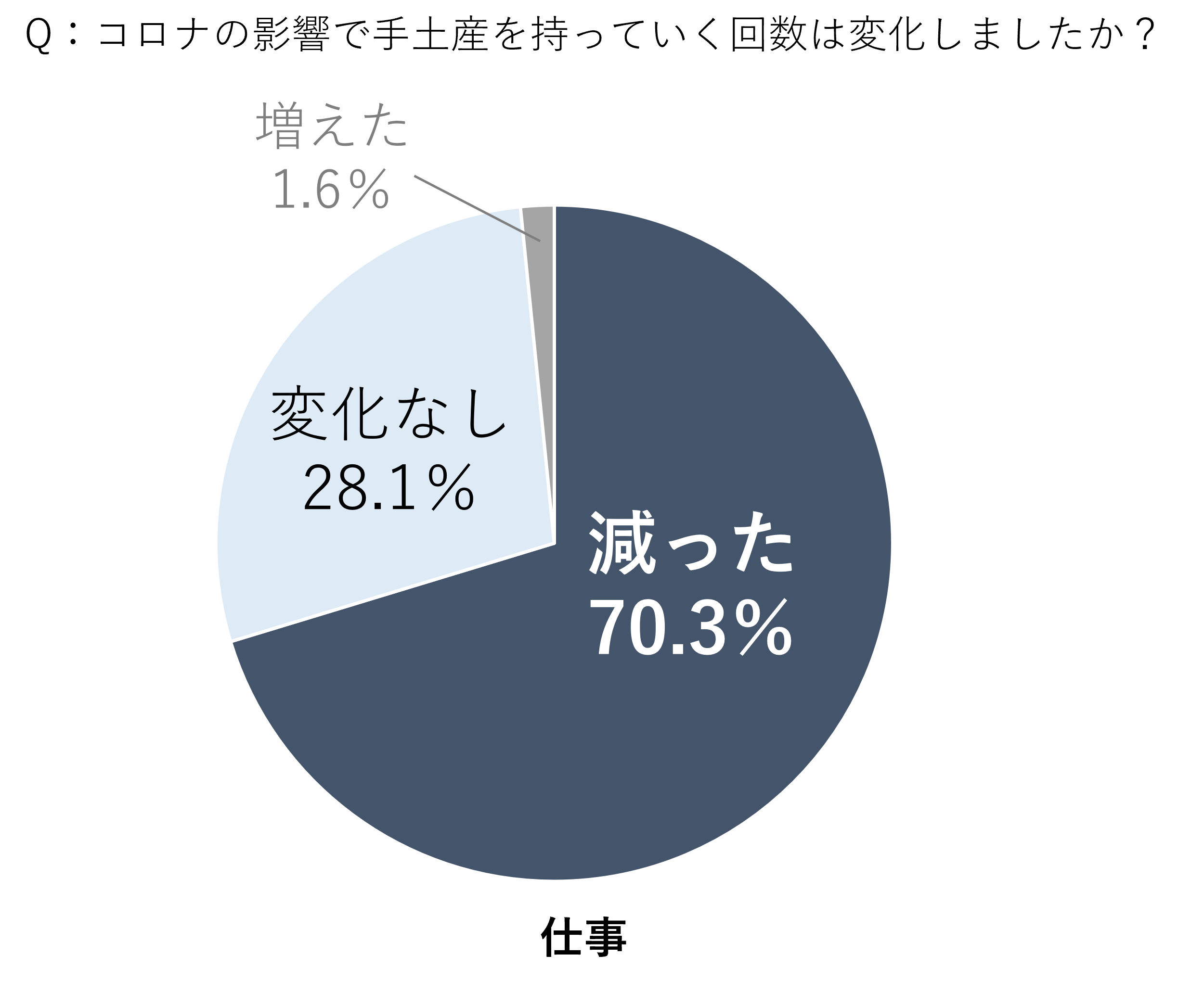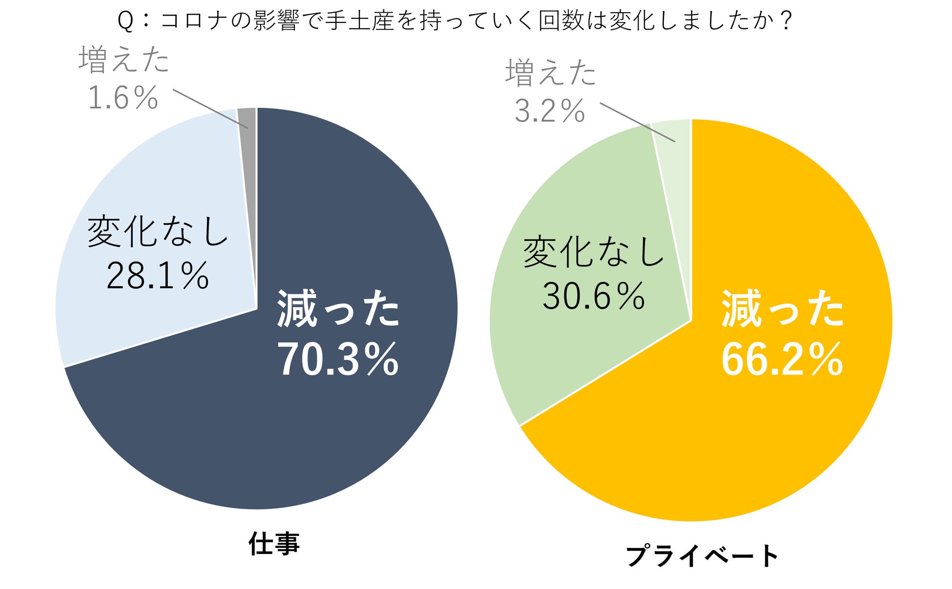 ☑ コロナの影響で、手土産を持っていく機会が減ったと回答した人は、仕事70.3%、プライベート66.2%
