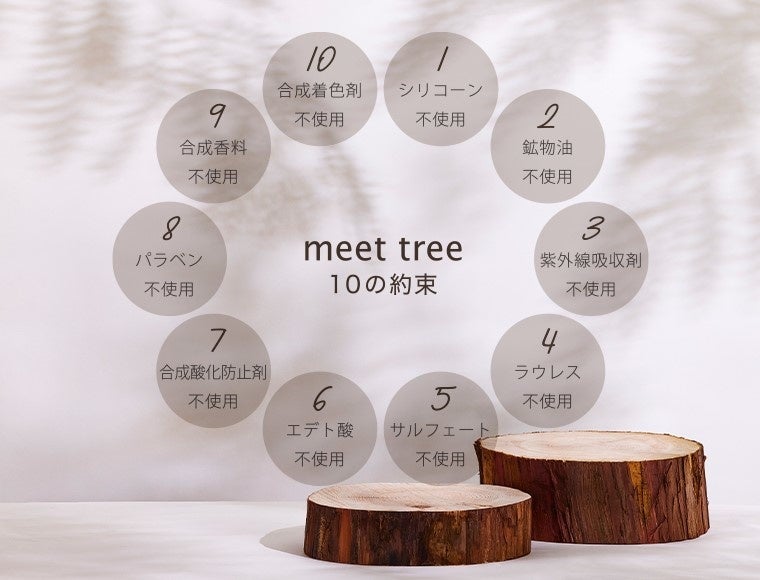 meet tree は、日本3銘木である木曽桧の産地 岐阜県中津川市で100年続く老舗木材会社から誕生した、人と環境にやさしいボタニカルライフスタイルブランドです。シャンプーやコンディショナーをはじめとする全ての商品には、10の添加物の不使用を約束しており、人や環境に影響のある添加物を除いた商品作りをしています。