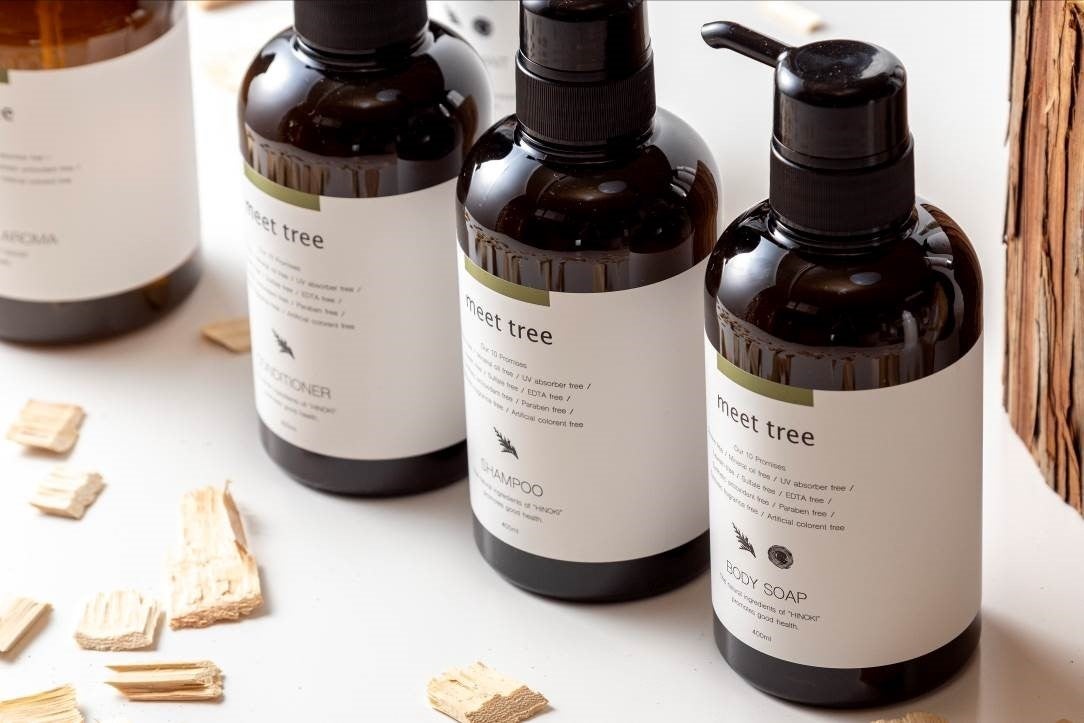 今回、meet treeが岐阜県中津川市で誕生したブランドであることと合わせて、10の添加物の不使用を約束するなど、人と環境に配慮したサステナブルな商品作りとヒノキの香りが決め手となり、「THE MACHIYA HOTEL TAKAYAMA」の貸し切り風呂と「THE MACHIYA HANARE」のアメニティに採用となりました。