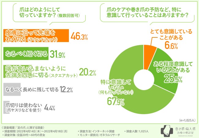 続いて、「爪のケアや巻き爪の予防など、特に意識して行っていることはありますか?」と質問したところ、7割近くの方が『特に意識していない(何も行っていない)(67.9%)』と回答した一方で、『とても意識していることがある(6.6%)』『ある程度意識していることがある(25.5%)』という回答にも支持が集まりました。